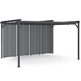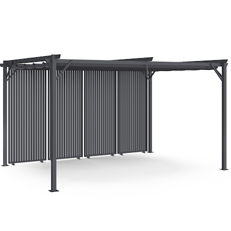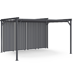 Passez d'agréables moments sur votre terrasse ou dans votre jardin grâce à la pergola édition collector avec ses persiennes aux lames verticales et son toit rétractable gris anthracite.Grâce à ses dimensions généreuses de L.4 x l.3 m, elle vous offrira un espace de vie supplémentaire pour profiter de votre extérieur tout au long de l'année. Vous pourrez ainsi aisément abriter votre salon de jardin.Cette jolie tonnelle de jardin est dotée de 4 portes persiennes aux lames verticales qui apporteront du cachet à votre terrasse tout en vous protégeant du soleil et des intempéries.Créez de l'ombre ou abritez vous de la pluie grâce à son toit rétractable monté sur rails.Son toit rétractable est composé d'une toile grise 100 % polyester qui s'adapte à vos besoins. Tendez la toile ou laissez passer les rayons du soleil en ouvrant le toit pour profiter d'un grand ensoleillement.Positionnez les portes claustras où vous le souhaitez, que ce soit sur la longueur ou sur la largeur, et personnalisez ainsi votre pergola.Élégante et contemporaine, cette pergola de dimensions 3,95 x 2,90 m, qui se fixe au sol, vous offrira un espace frais et ombragé sur votre terrasse tout l'été ! Sa structure robuste en métal laqué gris anthracite lui garantit une stabilité et une longévité parfaites.Nous vous conseillons, en cas d'intempéries (pluie et vent), de retirer la toile de sa structure afin de prévenir le risque de stagnation d'eau. Veillez également à bien fixer la pergola au sol pour assurer une stabilité optimale.Dimensions pergola toit rétractable gris avec persiennes verticalesDimensions globales : Longueur 395 cm x largeur 290 cm x Hauteur 220 cmDimensions des panneaux amovibles : L. 85 x H. 210 cmDimensions des pieds : 5 x 5 cmPoutres supérieures de dimensions : H. 50 x l. 25 mmMatériaux : structure en acier, toile en polyester 180 gr/m²Coloris : Structure gris anthracite, toile gris anthraciteA monter soi-mêmeRetrouvez également l'ensemble de nos pergolas sur notre boutique en ligne !