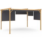 Passez d'agréables moments dans votre jardin grâce à cette pergola effet bois dotée d'un toit rétractable et ses 4 stores gris anthracite. Elle vous protège du soleil afin que vous profitiez des belles journées ensoleillées. La pergola effet bois toit rétractable gris anthracite s'adapte à vos besoins : créez un espace ombragé en tendant la toile ou au contraire, laissez passer les rayons du soleil en ouvrant la toile pour profiter d'un grand ensoleillement. Grâce à cette édition spéciale, vous pourrez également profiter de stores enrouleurs inclus ! Ajustez les stores latéraux selon vos envies et disposez d'un ombrage supplémentaire, idéal pour un repas à l'abri du soleil. Chaque pergola dispose de 2 stores de 120 x 225 cm et de 2 stores de 170 x 225 cm. Pour un ombrage optimal, nous vous conseillons d'installer 2 stores de 120 cm sur la largeur de la pergola (3M) et 2 stores de 170 cm sur la longueur de la pergola (4M). Vous pouvez cependant disposer les stores comme vous le souhaitez. Grâce à une structure en métal effet bois, cette pergola de 2.90 x 3.95 M vous assure stabilité et longévité. Robuste, la pergola se fixe au sol avec ses pieds de 5 x 5 cm. Conçue avec des matériaux de qualité, la pergola édition spéciale est équipée d'une toile 100% polyester 180 gr/m² pour le toit ainsi que de 4 stores enrouleurs 100% polyester 180 gr/m². N'attendez plus pour passer de joyeux moments en famille ou entre amis tout en profitant du soleil selon vos envies ! Nous vous conseillons en cas d'intempéries (pluie et vent) de retirer la toile de sa structure afin de prévenir le risque de stagnation d'eau. Nous vous recommandons également d'enlever les stores enrouleurs de la structure de la pergola en cas de forts vents. Veillez également à bien fixer la pergola au sol afin d'assurer une bonne stabilité.Dimensions de la pergola effet bois toit rétractable 3x4M Dimensions globales : Longueur 395 cm x largeur 290 cm x Hauteur 220 cmDimensions des pieds : 5 x 5 cmDimensions des 3 poutres supérieures : H. 50 x l. 25 x ép. 0,7 mm2 stores enrouleurs gris anthracite : largeur 120 x Hauteur 225 cm2 stores enrouleurs gris anthracite : largeur 170 x Hauteur 225 cmMatériaux : Structure en acier, toile (toit) 100 % polyester 180 gr/m²Coloris : Structure effet bois et toile gris anthraciteKit de fixation au sol inclusÀ monter soi-mêmeRetrouvez l'ensemble de notre gamme de pergolas sur notre boutique en ligne !
