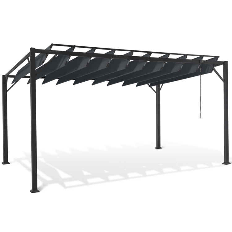 Descriptif de la pergola lames orientables grise 3x4 MModerne et très tendance, cette pergola gris anthracite et ses lames orientables vous protègent des rayons du soleil selon vos besoin. La tonnelle s'adapte aussi bien à votre terrasse qu'aux mouvements du soleil et permet un taux d'ombrage personnalisé.Parfaite alternative aux vérandas, cette pergola acier laisse circuler l'air librement tout en vous protégeant du soleil et des fortes chaleurs. Choisissez l'angle d'orientation des lames en tissu 100 % polyester et faîtes évoluer le toit selon vos envies.Design et moderne, la pergola vous propose de belles dimensions avec ses 4 M de longueur et ses 3 M de largeur. Son esthétisme apporte une touche de charme à votre extérieur et se marie à la perfection avec votre mobilier outdoor.Réglable à volonté et selon votre convenance, la pergola avec lames orientables peut se fermer, tout en conservant un léger espacement entre les lames, afin d'occulter les rayons du soleil et ainsi proposer une ambiance plus décontractée. Ajustez simplement les lames en tissu grâce à la manivelle et orientez-les selon vos envies. Votre pergola vous protégera aussi contre les fines pluies d'été.Le tissu des lames de votre pergola se glisse facilement dans leur structure. Chaque pièce est munie d'un zip sur la longueur, vous apprécierez l'ergonomie et le montage de la toile en polyester sur sa structure. Résistante et durable dans le temps, la pergola se fixe au sol grâce à ses pieds de 6 x 6 CM. Avec ses barres latérales en acier et ses lames en tissu de 160 gr/m2, votre pergola résiste au vent et aux différentes conditions climatiques.Nous vous conseillons en cas d'intempéries (pluie et vent) de retirer la toile de sa structure afin de prévenir le risque de stagnation d'eau. Veillez également à bien fixer la pergola au sol afin d'assurer une bonne stabilité.Dimensions de la pergola lames orientables grise 3x4 MDimensions hors tout : Longueur 400 x largeur 300 x Hauteur 220 cmDistance entre les pieds : Longueur 386 x largeur 286 cmDimensions des pieds : Longueur 6 x largeur 6 cmDimensions barres latérales / traverses : L.6 x l.3 cmDimensions des tubes : 20 x 14 mmNombre de lames orientables : 10Orientation jusqu'à 160°Matériaux de la structure : acierMatériaux qui enveloppent les lames : tissu 100% polyester 160 gr/m²Retrouvez l'ensemble de nos pergolas sur notre boutique en ligne !