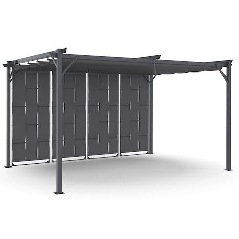 Passez d'agréables moments sur votre terrasse ou dans votre jardin grâce à cette pergola 3 x 4 m et son toit rétractable gris anthracite.Grâce à ses dimensions généreuses de L.4 x l.3 m, elle vous offrira un espace de vie supplémentaire pour profiter de votre extérieur tout au long de l'année. Vous pourrez ainsi aisément abriter votre salon de jardin.Cette jolie tonnelle de jardin est dotée de 4 portes persiennes en tissu qui apporteront du cachet à votre terrasse tout en vous protégeant du soleil et des intempéries.Créez de l'ombre ou abritez-vous de la pluie grâce à son toit rétractable monté sur rails.Son toit rétractable est composé d'une toile grise 100 % polyester qui s'adapte à vos besoins. Tendez la toile, ou laissez passer les rayons du soleil en ouvrant le toit pour profiter d'un grand ensoleillement.Positionnez les persiennes en tissu où vous le souhaitez, que ce soit sur la longueur ou sur la largeur, et personnalisez ainsi votre pergola.Élégante et contemporaine, cette pergola de dimensions 3,95 x 2,90 m, qui se fixe au sol, vous offrira un espace frais et ombragé sur votre terrasse tout l'été ! Sa structure robuste en métal laqué gris anthracite lui garantit une stabilité et une longévité parfaites.Nous vous conseillons, en cas d'intempéries (pluie et vent), de retirer la toile de sa structure afin de prévenir le risque de stagnation d'eau. Veillez également à bien fixer la pergola au sol pour assurer une stabilité optimale.Dimensions pergola toit rétractable gris persiennes en tissu Dimensions globales : Longueur 395 cm x largeur 290 cm x Hauteur 220 cmDimensions des panneaux amovibles : L. 85 x H. 210 cmDimensions des pieds : 5 x 5 cmPoutres supérieures de dimensions : H. 50 x l. 25 x ep 0,7 mmMatériaux : structure en acier, toile en polyester 180 gr/m²Coloris : Structure gris anthracite, toile gris anthraciteA monter soi-mêmeRetrouvez également l'ensemble de nos pergolas sur notre boutique en ligne !