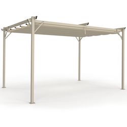 Cette superbe tonnelle de jardin donnera du cachet à votre terrasse et vous protégera du soleil et des intempéries grâce à son toit rétractable très pratique.Élégante et contemporaine, cette pergola 3,95 x 2,90 M qui se fixe au sol vous offrira un espace frais et ombragé sur votre terrasse tout l'été !Son toit rétractable monté sur rails avec toile beige 100% polyester 180 gr/m² revêtement en polyamide lui apporte élégance et modernité.Au choix, vous restez à l'ombre sous la toile ou au contraire vous bronzez en la coulissant selon l'orientation du soleil.Sa structure robuste en métal beige lui assure une parfaite stabilité et longévité.Nous vous conseillons en cas d'intempéries (pluie et vent) de retirer la toile de sa structure afin de prévenir le risque de stagnation d'eau. Veillez également à bien fixer la pergola au sol afin d'assurer une bonne stabilité.Dimensions pergola toit rétractable beigeDimensions totales hors tout : Longueur 395 CM x largeur 290 CM x Hauteur 220 CMDimensions d'un pied : 5 x 5 CMMatériaux : Structure en acier, toile en polyester 180 gr/m²Coloris : Structure beige, toile beigePoutres supérieures de dimensions : H. 50 x l. 25 x ep 0,7 mmDistance entre les pieds : 257 / 362 cmRetrouvez également l'ensemble de nos pergolas !