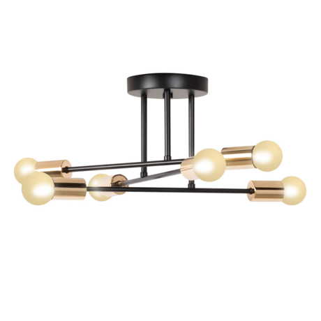 Éclairez votre intérieur avec élégance et efficacité grâce à cette lampe suspendue 6 ampoules au design industriel chic ! Son mélange de coloris s'associe facilement avec tous les styles de décoration, le métal noir et les finitions dorées apportent un look moderne et glamour à votre pièce de vie. Idéale dans une chambre, une salle à manger ou un salon, la suspension 6 lumières saura vous séduire ! À accrocher au-dessus d'un lit ou d'une table à manger, elle créera une ambiance cocooning et tendance. Ce luminaire est équipé de 3 branches avec une ampoule à chaque extrémité. Grâce à leurs différentes positions, les branches entrecroisées et les embouts dorés offrent un éclairage à la fois harmonieux et doux. Les lignes simples et élégantes du plafonnier apporteront un style sophistiqué à votre décoration intérieure.Créez l'intensité lumineuse idéale selon vos besoins. Muni de douilles type E27, vous pouvez opter pour une ampoule à filament apparent ou une ampoule plus altique selon l'ambiance que vous souhaitez donner à votre pièce de vie. Laissez-vous séduire par ce plafonnier en métal noir et doré, le style industriel et vintage ne passera pas inaperçu aux yeux de vos invités !Description de la suspension noire et dorée 6 lampesDimensions globales : Longueur 60 cm x largeur 60 cm x Hauteur 22 cmDiamètre du support : Ø 15 cmLongueur d'une branche : 44 cmMatériaux : métal noir et doréType de douille (ampoules non fournies) : E27Puissance : 40 WFourni sans ampouleKit de fixation fourni (chevilles et vis)Découvrez l'ensemble de nos luminaires et lampes de chevet sur notre boutique en ligne.Et si vous aimez ce style de décoration, retrouvez nos collections industrielle et vintage.