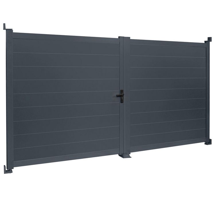 Offrez à votre propriété une protection à la fois moderne et robuste avec ce portail 302 x 160 cm en aluminium gris anthracite.Son coloris gris anthracite et son design moderne et élégant s'intégreront harmonieusement à votre extérieur. Il se fondra parfaitement dans le paysage tout en ajoutant une touche de sophistication.Son design vous offrira une protection contre les regards des voisins et des passants. Restez ainsi à l'abri des regards et délimitez votre espace extérieur grâce à notre portail et l'ensemble de nos occultants. Très pratique, le portail dispose de 2 portes battantes L. 302 x H. 160 cm, d'une butée d'arrêt centrale et de 2 poignées, une de chaque côté, offrant une large ouverture pour une accessibilité optimale. Lors du montage, choisissez le sens d'ouverture de votre portail et de sa butée d'arrêt en fonction de votre extérieur et du positionnement souhaité. Pour une installation parfaite, la distance entre les poteaux doit être de L. 309 x H. 172 cm. Verrouillable grâce à une serrure à clé, ce portail garantit la sécurité de votre propriété. Le portail peut ainsi être verrouillé à clé, et trois clés sont fournies pour une tranquillité d'esprit maximale. Fabriqué en aluminium, le portail 302 x 160 cm est conçu pour résister aux conditions extérieures au fil des années. Sa structure aluminium lui garantit ainsi durabilité et robustesse. Livré avec un kit de visserie et de fixation complet, le portail se fixe au mur afin de résister aux intempéries. Facile à installer, il est également très simple à entretenir. Le portail est équipé d'une serrure robuste et d'une poignée pour une utilisation sécurisée et pratique au quotidien.N'attendez plus pour sécuriser votre maison et votre extérieur ! Que ce soit pour délimiter votre propriété ou sécuriser votre jardin, ce portail est le choix idéal pour allier praticité, esthétique et longévité. Pour parfaire votre entrée extérieur, découvrez également nos auvents de porte d'entrée. Ce portail peut être monté par une seule personne, mais lors de la fixation au mur, nous vous recommandons d'être 2 personnes minimum. Dimensions du portail 302 x 160 cm aluminium gris anthraciteDimensions globales (entre les poteaux) : Longueur 309 x Hauteur 172 cm Dimensions des portes : L. 302 x H. 160 cmDimensions d'une porte : L. 150 x H. 160 cmDimensions des montants : L. 7 x l. 4.5 x H. 160 cmDimensions des traverses : L. 136 x l. 3.5 x H. 7 cmDimensions d'une latte : L. 136 x l. 2 x H. 16 cmProfondeur avec poignée : l. 16 cmType d'ouverture : battantMatériaux : aluminiumColoris : gris anthraciteInclus : 2 poignées, serrure à clé (3 clés), butée d'arrêt centrale, kit de visserie completÀ monter soi-même Retrouvez également tous nos portillons de jardin sur notre boutique en ligne.
