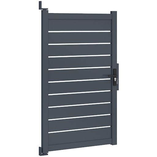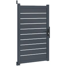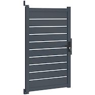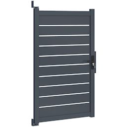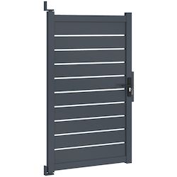 Offrez à votre propriété une protection à la fois moderne et robuste avec ce portillon 100 x 160 cm en aluminium gris anthracite ajouré.Son coloris gris anthracite et son design moderne et élégant s'intégreront harmonieusement à votre extérieur et s'associeront facilement à votre portillon. Il se fondra parfaitement dans le paysage tout en ajoutant une touche de sophistication.Son design ajouré vous offrira une protection contre les regards des voisins et des passants tout en laissant passer un peu de lumière grâce à ses petites ouvertures de 1,3 cm entre chaque latte. Restez ainsi à l'abri des regards et délimitez votre espace extérieur grâce à notre portillon et l'ensemble de nos occultants. Très pratique, ce portillon dispose d'une porte battante, d'une butée d'arrêt centrale et de 2 poignées, une de chaque côté, offrant une large ouverture pour une accessibilité optimale à pied ou à vélo par exemple. Lors du montage, choisissez le sens d'ouverture de votre portillon et de sa butée d'arrêt centrale en fonction de votre extérieur et du positionnement souhaité. Pour une installation parfaite, la distance entre les poteaux doit être de L. 105 x H. 172 cm. Verrouillable grâce à une serrure à clé, ce portillon garantit la sécurité de votre propriété. Le portillon peut ainsi être verrouillé à clé, et trois clés sont fournies pour une tranquillité d'esprit maximale. Fabriqué en aluminium, le portillon 100 x 160 cm est conçu pour résister aux conditions extérieures au fil des années. Sa structure aluminium lui garantit ainsi durabilité et robustesse. Livré avec un kit de visserie et de fixation complet, le portillon se fixe au mur afin de résister aux intempéries. Facile à installer, il est également très simple à entretenir. Le portillon est équipé d'une serrure robuste et d'une poignée pour une utilisation sécurisée et pratique au quotidien.N'attendez plus pour sécuriser votre maison et votre extérieur ! Que ce soit pour délimiter votre propriété ou sécuriser votre jardin, ce portillon est le choix idéal pour allier praticité, esthétique et longévité. Pour parfaire votre entrée extérieur, découvrez également nos auvents de porte d'entrée.Dimensions du portillon 100 x 160 cm aluminium ajouré gris anthraciteDimensions globales (entre les poteaux) : Longueur 105 x Hauteur 172 cm Dimensions de la porte : L. 100 x H. 160 cmDimensions des montants : L. 7 x l. 4,5 cm x H. 160 cmDimensions des traverses : L. 100 x l. 3,5 x H. 7 cmHauteur d'une latte : 13 cmEspace entre les lattes : 1,3 cmType d'ouverture : battantMatériaux : aluminiumColoris : gris anthraciteInclus : 2 poignées, serrure à clé (3 clés), butée d'arrêt, kit de visserie completÀ monter soi-même Retrouvez tous nos portillons de jardin sur notre boutique en ligne.