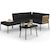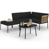 Salon de jardin bas RIO 4 places modulable structure métal noir, cordage effet rotin clair avec coussins noirs et table basse