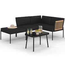 Craquez pour le salon de jardin RIO et profitez de moments chaleureux dans votre jardin ou sur votre terrasse ! Avec son look bicolore et bi-matière en acier noir et cordage rotin clair, ce salon de jardin 4 places apportera design et esthétisme à votre extérieur ! Composé de 2 fauteuils et d'un sofa recouverts d'un épais coussin noir ultra confortable, ce salon est idéal pour profiter de votre extérieur confortablement installé. Ingénieux et modulable, ce salon de jardin s'adapte à vos envies avec 5 configurations possibles grâce à sa structure astucieuse. De plus sa table basse de L.65 x l.42 x H.35 cm vous permet d'y poser vos encas et boissons fraîches pour les avoir à portée de main tout en profitant de longues journées ensoleillées et soirées d'été entre amis. Que vous preniez un bain de soleil ou que vous profitiez d'un apéro à plusieurs, soyez sûr d'apprécier chaque moment passé dans votre jardin.Fabriqué avec des matériaux de qualité, le salon RIO vous garantit stabilité, robustesse et résistance au soleil ainsi qu'aux intempéries ! Ce salon de jardin tendance et cocooning apportera la touche d'exotisme indispensable à votre extérieur. L'association du canapé et des fauteuils, tous munis d'accoudoirs en polyrotin clair, créée une ambiance chaleureuse. Pour parfaire votre ensemble, vous pouvez l'agrémenter d'un tapis d'extérieur ainsi que de lumières d'ambiance !Ce salon de jardin bas 4 places est parfait pour les retrouvailles en famille comme entre amis pour profiter du beau temps ! Les accoudoirs effet rotin apportent design et modernité et ce salon bas deviendra rapidement l'élément indispensable de vos soirées d'été et de vos déjeuners au soleil.Dimensions du salon de jardin bas RIODimensions globales des fauteuils : Longueur 65 cm x largeur 62 cm x Hauteur 68 cmDimensions globales du canapé : Longueur 119 cm x largeur 62 cm x Hauteur 68 cmDimensions globales de la table : Longueur 60 cm x largeur 38 cm x Hauteur 40 cmStructure en acier noir et accoudoirs en polyrotinCoussin en polyester 180gr/m² noir épaisseur 6 cmPlateau de la table en verre trempé4 places5 compositions possiblesCoussins inclusÀ monter soi-mêmeRetrouvez tous nos salons de jardin sur notre boutique en ligne !