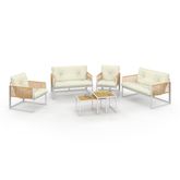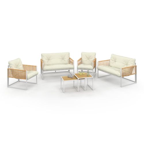 Salon de jardin bas RIO 6 places structure métal blanc et cordage effet rotin avec coussins beige