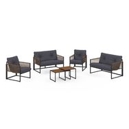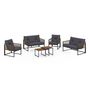 Craquez pour le salon de jardin RIO et profitez de moments chaleureux dans votre jardin ou sur votre terrasse ! Avec son look bicolore et bi-matière en acier gris et cordage marron ce salon 6 places apportera design et esthétisme à votre extérieur ! Composé de 2 fauteuils et de 2 sofas recouverts d'un épais coussin gris ultra confortable, ce salon est idéal pour profiter de votre extérieur confortablement installé. De plus ses petites tables basse vous permettent d'y poser vos encas et boissons fraîches pour les avoir à portée de main tout en profitant de longues journées ensoleillées et soirées d'été entre amis. Que vous preniez un bain de soleil ou que vous profitiez d'un apéro à plusieurs, soyez sûr d'apprécier chaque moment passé dans votre jardin.Fabriqué avec des matériaux de qualité, le salon RIO vous garantit stabilité, robustesse et résistance au soleil ainsi qu'aux intempéries ! Ce salon de jardin tendance et cocooning apportera la touche d'exotisme indispensable à votre extérieur. L'association des canapés et des fauteuils, tous munis d'accoudoirs en polyrotin marron, créée une ambiance chaleureuse. Pour parfaire votre ensemble, vous pouvez l'agrémenter d'un tapis d'extérieur ainsi que de lumières d'ambiance !Ce salon de jardin bas 6 places est parfait pour les retrouvailles en famille comme entre amis pour profiter du beau temps ! Ce salon bas deviendra rapidement l'élément indispensable de vos soirées d'été et de vos déjeuners au soleil.Dimensions du salon de jardin bas RIODimensions fauteuils : Longueur 60 cm x largeur 70 cm x Hauteur 67 cmDimensions canapé : L. 114 x l. 70 x H. 67 cmDimensions table basse 1 : L. 65 x L. 42 x H. 35 cmDimensions table basse 2 : L. 48 x l. 48 x H. 40 cmMatériaux : Structure en acier, accoudoirs en polyrotin, coussins en polyester 180 gr/m², plateau de table en DPCCouleur : Gris anthracite et rotinNombre de places : 6Composition : 2x fauteuils, 2x sofas, 2x tables bassesÀ monter soi-mêmeRetrouvez tous nos salons de jardin sur notre boutique en ligne !