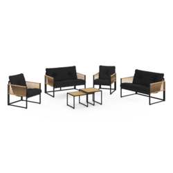 Salon de jardin bas RIO 6 places structure métal noir, cordage effet rotin clair et coussins noir