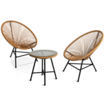 Composé de 2 fauteuils design dit > et d'une table basse avec plateau en verre trempé, ce salon de jardin aux cordages de couleur beige imitation rotin apportera une touche tendance et originale à votre extérieur !Avec son plateau amovible en verre trempé, la table l.45 x H.46,5 CM est facile à nettoyer.Conçus pour les moments de détente, les fauteuils L. 70 x l.70 x H. 80 cm sont extrêmement confortables ! De plus, la table avec plateau amovible en verre trempé vous permet de prendre votre petit déjeuner en terrasse le matin, de vous poser pour bouquiner l'après-midi ou encore de partager un moment convivial en soirée.Stable et robuste avec sa structure en acier 16/19 mm composée de 3 pieds qui soutiennent l'assise en cordage plastique, ce salon de jardin résistera au soleil et aux intempéries.Cet ensemble design et pratique se nettoie en quelques secondes pour vous permettre de profiter encore plus de votre extérieur.N'hésitez pas à agrémenter votre salon bas d'extérieur avec des lampes d'ambiance LED pour un rendu plus cocooning et convivial en soirée !Enfin, son design peut également trouver sa place en intérieur, dans votre salon ou votre bureau pour un joli look rétro.Entre design et confort, ce salon saura charmer vos invités !Dimensions du salon de jardin fil plastique coloris rotinDimensions d'un fauteuil : Longueur 70 cm x largeur 70 cm x Hauteur 80 cmHauteur du dossier : 59 cmDimensions de l'assise : l. 40 x H. 41,5 cmDimensions de la table : Ø 45 x H. 46,5 cmÉpaisseur du plateau table en verre trempé : 5 mmStructure en acier 16/19 mmAssise et dossier en plastiqueÀ monter soi-mêmeRetrouvez notre salon de jardin IZMIR en différents coloris : - Salon de jardin IZMIR table et 2 fauteuil œuf cordage noir- Salon de jardin IZMIR table et 2 fauteuil œuf cordage bleu canard- Salon de jardin IZMIR table et 2 fauteuils œuf cordage terracottaDécouvrez également nos salons de jardin disponibles sur notre boutique en ligne !