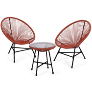 Ce salon de jardin aux cordages couleur terracotta apportera une touche tendance et originale à votre extérieur grâce à ses 2 fauteuils design dit > et sa table basse avec plateau en verre trempé ! Son look intemporel s'accordera parfaitement avec tous types d'extérieurs et trouvera sa place aussi bien dans votre jardin, sur votre terrasse ou sur votre balcon ! Composé de 2 fauteuils et d'une table basse, ce salon vous permet de prendre votre petit-déjeuner en terrasse le matin, de vous poser pour bouquiner l'après-midi ou encore de partager un moment convivial en soirée.Grâce à son plateau amovible en verre trempé, la table l.45 x H.46,5 cm est facile à nettoyer. De plus, les fauteuils L. 70 x l.70 x H. 80 cm sont extrêmement confortables et parfaits pour s'octroyer un moment de détente. Doté d'une structure en acier 16/19mm composée de 3 pieds qui soutiennent l'assise en cordage plastique, ce salon de jardin est stable et robuste et résistera au soleil et aux intempéries.Cet ensemble pratique et design se nettoie rapidement pour vous permettre de profiter encore plus de votre extérieur.Vous pouvez aussi bien placer votre salon de jardin dans votre salon, en intérieur ou dans votre bureau pour un joli look rétro.N'hésitez pas à agrémenter votre salon bas d'extérieur avec un tapis extérieur ou des lampes d'ambiance LED pour un rendu convivial et plus cocooning lors de vos soirées !Ce salon saura charmer vos invités à coup sûr, grâce à son confort et son design tendance ! Dimensions du salon de jardin fil plastique terracottaDimensions d'un fauteuil : Longueur 70 cm x largeur 70 cm x Hauteur 80 cmHauteur du dossier : 59 cmDimensions de l'assise : l. 40 x H. 41,5 cmDimensions de la table : Ø 45 x H. 46,5 cmÉpaisseur du plateau table en verre trempé : 5 mmStructure en acier 16/19 mmAssise et dossier en plastiqueÀ monter soi-mêmeRetrouvez notre salon de jardin IZMIR en différents coloris : - Salon de jardin IZMIR table et 2 fauteuils œuf cordage effet rotin- Salon de jardin IZMIR table et 2 fauteuils œuf cordage noir- Salon de jardin IZMIR table et 2 fauteuils œuf cordage bleu canardDécouvrez également nos salons de jardin disponibles sur notre boutique en ligne !