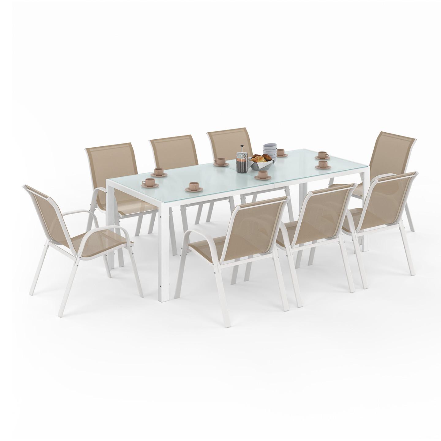 Salon de jardin MADRID table 190 cm et 8 chaises empilables blanc et beige