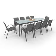 Salon de jardin MADRID table 240 CM et 10 chaises empilables gris anthracite plateau clair
