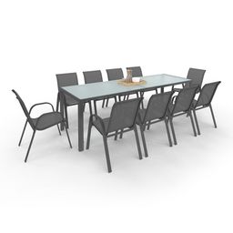 Prenez vos repas en plein air et invitez votre famille et vos amis à se réunir autour de ce salon de jardin MADRID ! Avec sa capacité d'accueil de 10 personnes, profitez de moments chaleureux à plusieurs et échangez en toute convivialité ! Grâce à ses 10 chaises empilables, cet ensemble de jardin propose ergonomie et facilité d'installation. Sa structure en acier gris, pensée pour les repas en extérieur, lui confère robustesse et longévité.Composé d'un plateau de table en verre trempé, le salon MADRID apporte modernité et design dans votre jardin ou sur votre terrasse. La structure en acier ainsi que le dossier et l'assise des chaises en textilène facilitent l'entretien de cet ensemble table et chaises de jardin.Le design gris anthracite du salon MADRID apportera modernité à votre extérieur et s'intégrera à coup sûr avec tout autre type de mobilier !De plus, si vous souhaitez protéger votre salon de jardin, installez une housse pour chaises de jardin ainsi qu'une housse pour table de jardin.Profitez des beaux jours grâce au salon de jardin MADRID et usez de son ergonomie pour partager en famille ou entre amis des moments de bien-être ! Dimensions du salon de jardin MADRID 10 placesEnsemble composé d'une table et de 10 chaises empilablesDimensions de la table : Longueur 240 cm x largeur 80 cm x Hauteur 73 cmDimensions des pieds : L. 40 x l. 20 mm (épaisseur : 0.9 mm)Matériaux : Structure en acier, plateau de table en verre trempé (5 mm)Dimensions d'une chaise : L. 51,5 x l. 68 x H. 84 cmDimensions de l'assise : L. 42 x l. 45 x H. 41.5 cm Dimensions du dossier : L. 42 x H. 47 cmMatière du dossier et de l'assise : textilèneColoris : Gris anthracite plateau clairÀ monter soi-mêmeDécouvrez également tous nos salons de jardin sur notre boutique en ligne !