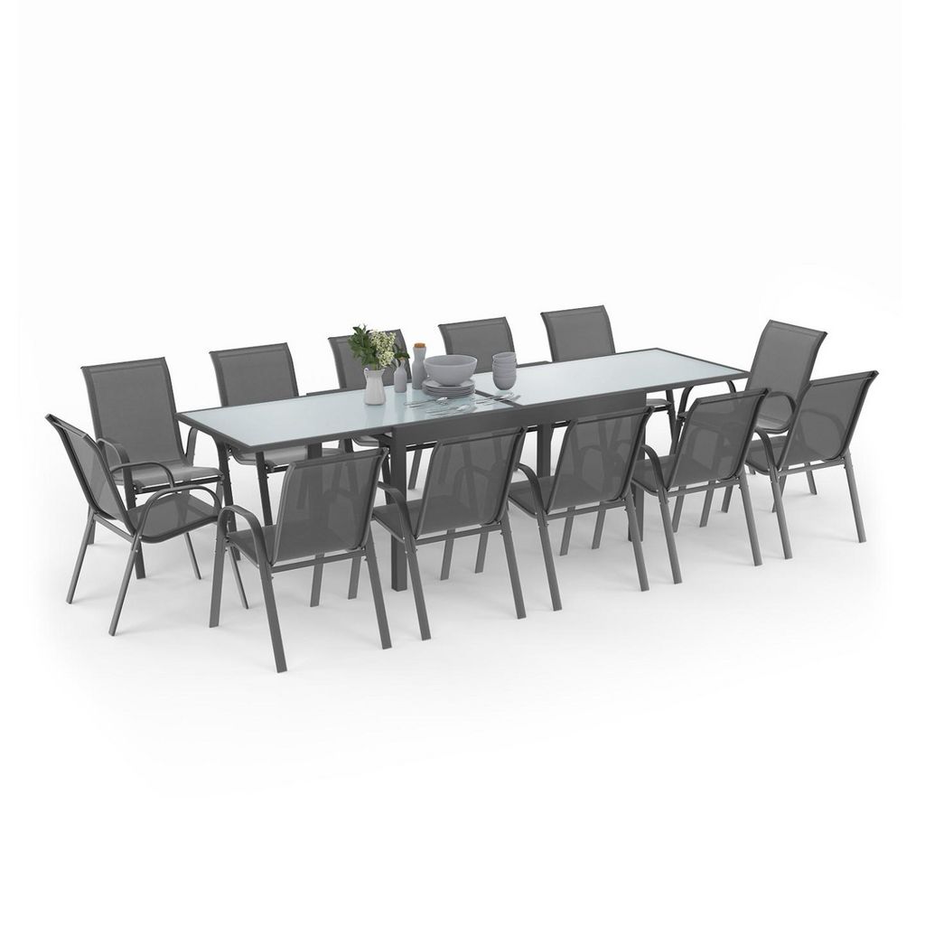 Salon de jardin MADRID table extensible 135-270 CM et 12 chaises empilables gris anthracite
