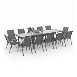 Installez-vous confortablement autour de cet ensemble de jardin MADRID et partagez un bon repas en plein air avec vos amis ou votre famille. Grâce à sa capacité d'accueil pouvant aller jusqu'à 12 personnes, profitez de moments chaleureux à plusieurs et échangez en toute convivialité ! Doté d'un plateau en verre trempé opaque et d'une structure en aluminium, la table du salon MADRID est à la fois robuste et idéale pour une utilisation en extérieur !Les chaises de jardin quant à elles sont dotées d'une assise et d'un dossier en textilène facilitant leur entretien et d'une structure en acier.Le design gris anthracite du salon MADRID apportera modernité à votre extérieur et se mariera parfaitement avec tout autre type de mobilier !Ergonomie et praticité caractérisent le salon de jardin MADRID 12 places! En effet, grâce à sa table de jardin extensible, vous pouvez accueillir un grand nombre de convives mais surtout replier la table lorsque vous n'en avez plus besoin pour un gain de place sur votre terrasse!De plus les chaises sont également empilables afin de faciliter leur rangement et les entreposer facilement sans vous encombrer à la fin de la saison. De plus, si vous souhaitez protéger votre salon de jardin, installez une housse pour chaises de jardin ainsi qu'une housse pour table de jardin.Idéal pour profiter de votre extérieur, ce salon de jardin MADRID vous garantit robustesse et longévité.Recevez un grand nombre de convives tout l'été et passez des moments de bien-être et de convivialité grâce au salon de jardin extensible MADRID 12 places ! Dimensions du salon de jardin MADRID gris foncé 12 placesEnsemble composé d'une table et de 12 chaises empilablesDimensions de la table dépliée : Longueur 270 cm x largeur 80 cm x Hauteur 73 cmDimensions de la table pliée : L. 135 x l. 80 x H. 73 cmDimensions des pieds de la table : L. 5 x l. 5 x H. 65 cmStructure en aluminium / plateau en verre trempé / coloris : gris anthraciteDimensions d'une chaise : L. 51,5 x l. 68 x H. 84 cmDimensions des accoudoirs : L. 4,2 cm x H. 58,5 cm x ép. 13 mm Dimensions de l'assise : L. 42 x l. 45 x H. 41,5 cmDimensions du dossier : L. 42 x H. 47 cmStructure en acier / matière du dossier et de l'assise : textilène / coloris : gris anthraciteÀ monter soi-même Cet ensemble table et chaises de jardin est également disponible dans d'autres dimensions :- Salon de jardin MADRID 150 cm et 6 chaises- Salon de jardin MADRID 190 cm et 8 chaises- Salon de jardin MADRID 190 cm et 8 chaises structure blancheDécouvrez également tous nos salons de jardin sur notre boutique en ligne !