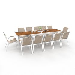 Salon de jardin NOUMEA extensible table 135/270 cm plateau verre trempé effet bois et 12 chaises empilables blanc et bois