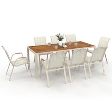 Profitez de repas en plein air dès l'arrivée des beaux jours grâce à l'ensemble de jardin NOUMEA ! Avec sa capacité d'accueil de 8 personnes, profitez de moments chaleureux en famille ou entre amis et échangez en toute convivialité !Le salon de jardin NOUMEA est composé d'une grande table de 190 cm de long plateau et de 8 chaises en textilène beige et accoudoirs effet bois assortis. Ce look bicolore et bi-matière, à la fois moderne et élégant s'intègrera parfaitement à votre extérieur et autres mobiliers de jardin. Pratiques, les 8 chaises qui composent ce salon s'empilent très facilement pour vous permettre de les ranger facilement pour la saison hivernale ou lorsque vous ne les utilisez pas. Grâce à leur assise en textilène, souple et agréable et aux accoudoirs avec revêtement effet bois, vous serez confortablement installé pour passer un agréable moment en extérieur, comme si vous étiez dans un fauteuil ! La structure en acier beige des chaises et de la table, associée au plateau en verre trempé effet bois et au textilène des chaises, confèrent à ce salon robustesse et longévité ! Si vous souhaitez protéger votre salon de jardin lorsque vous ne l'utilisez pas, installez une housse pour chaises de jardin ainsi qu'une housse pour table de jardin.Profitez des beaux jours grâce au salon de jardin NOUMEA et usez de son ergonomie pour partager en famille ou entre amis des moments de bien-être et de convivialité !Dimensions du salon de jardin NOUMEA 8 places Dimensions globales de la table: Longueur 190 cm x largeur 80 x Hauteur 73 cmDimensions globales des chaises : Longueur 52 cm x largeur 65 cm x Hauteur 84 cmStructure de la table et des chaises : AcierPlateau de la table : verre trempé effet boisMatière du dossier et de l'assise des chaises : TextilèneColoris : Beige et boisÀ monter soi-mêmeDécouvrez également tous nos salons de jardin sur notre boutique en ligne !
