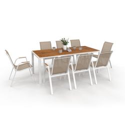 Profitez de repas en plein air dès l'arrivée des beaux jours grâce à l'ensemble de jardin NOUMEA ! Avec sa capacité d'accueil de 8 personnes, profitez de moments chaleureux en famille ou entre amis et échangez en toute convivialité !Le salon de jardin NOUMEA est composé d'une grande table de 190 cm de long et de 8 chaises en textilène blanc et accoudoirs effet bois assortis. Ce look bicolore et bi-matière, à la fois moderne et élégant s'intègrera parfaitement à votre extérieur et autres mobiliers de jardin. Pratiques, les 8 chaises qui composent ce salon s'empilent très facilement pour vous permettre de les ranger facilement pour la saison hivernale ou lorsque vous ne les utilisez pas. Grâce à leur assise en textilène, souple et agréable et aux accoudoirs avec revêtement effet bois, vous serez confortablement installé pour passer un agréable moment en extérieur, comme si vous étiez dans un fauteuil ! La structure en acier blanc des chaises et de la table, associée au plateau verre trempé effet bois et accoudoirs DPC effet bois et au textilène des chaises, confèrent à ce salon robustesse et longévité ! Si vous souhaitez protéger votre salon de jardin lorsque vous ne l'utilisez pas, installez une housse pour chaises de jardin ainsi qu'une housse pour table de jardin.Profitez des beaux jours grâce au salon de jardin NOUMEA et usez de son ergonomie pour partager en famille ou entre amis des moments de bien-être et de convivialité !Dimensions du salon de jardin NOUMEA 8 places Dimensions globales de la table: Longueur 190 cm x largeur 80 cm x Hauteur 73 cmDimensions globales des chaises : Longueur 52 cm x largeur 65 cm x Hauteur 84 cmStructure de la table et des chaises : AcierMatériaux : Plateau verre trempé, accoudoirs en DPC effet bois et assiste en textilèneColoris : Blanc et boisÀ monter soi-mêmeDécouvrez également tous nos salons de jardin sur notre boutique en ligne !