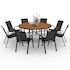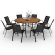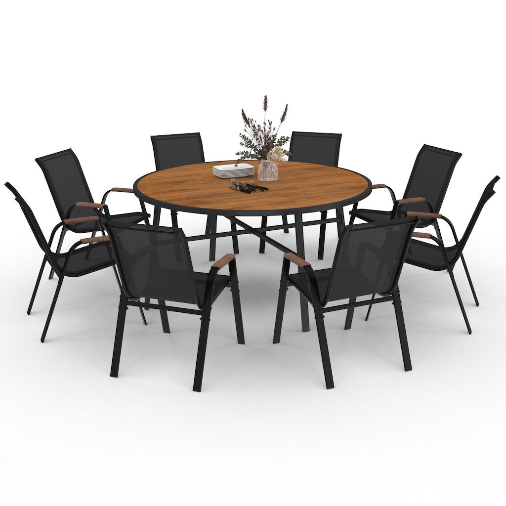Salon de jardin NOUMEA table ronde 150 cm plateau verre trempé effet bois et 8 chaises empilables noir et bois
