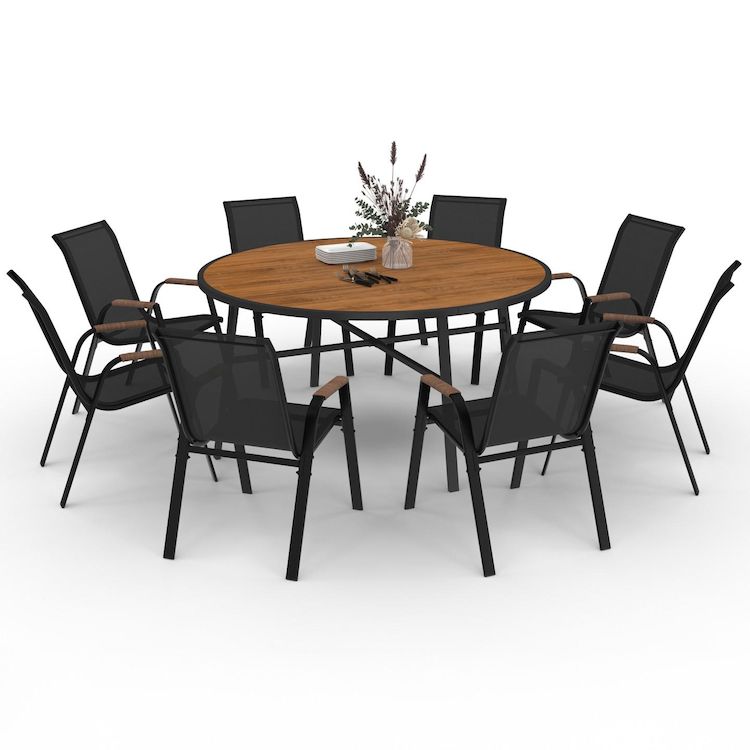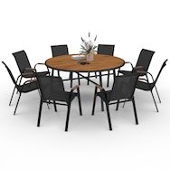 Profitez de repas en plein air dès l'arrivée des beaux jours grâce à l'ensemble de jardin NOUMEA ! Avec sa capacité d'accueil de 8 personnes, profitez de moments chaleureux en famille ou entre amis et échangez en toute convivialité !Le salon de jardin NOUMEA est composé d'une grande table ronde de 150 cm de diamètre et de 8 chaises en textilène noir et accoudoirs effet bois assortis. Ce look bicolore et bi-matière, à la fois moderne et élégant s'intègrera parfaitement à votre extérieur et autres mobiliers de jardin. Pratiques, les 8 chaises de jardin qui composent ce salon s'empilent très facilement pour vous permettre de les ranger facilement pour la saison hivernale ou lorsque vous ne les utilisez pas. Grâce à leur assise en textilène, souple et agréable et aux accoudoirs avec revêtement effet bois, vous serez confortablement installé pour passer un agréable moment en extérieur, comme si vous étiez dans un fauteuil ! La structure en acier noir des chaises et de la table, associée au plateau en verre trempé effet bois et au textilène des chaises, confèrent à ce salon robustesse et longévité ! Si vous souhaitez protéger votre salon de jardin lorsque vous ne l'utilisez pas, installez une housse pour chaises de jardin ainsi qu'une housse pour table de jardin.Profitez des beaux jours grâce au salon de jardin rond noir et bois NOUMEA et usez de son ergonomie pour partager en famille ou entre amis des moments de bien-être et de convivialité !Dimensions du salon de jardin rond NOUMEA 8 places Dimensions globales de la table : Longueur 150 cm x largeur 150 cm x Hauteur 73 cmDimensions globales d'une chaise : Longueur 51,5 cm x largeur 68 cm x Hauteur 84 cmDimensions de l'assise d'une chaise : L. 41,5 x l. 42 x H. 42 cmStructure de la table et des chaises : acierPlateau de la table : verre trempé effet bois, épaisseur 5 mmMatière du dossier et de l'assise des chaises : textilèneColoris : noir et boisÀ monter soi-mêmeDécouvrez également tous nos salons de jardin sur notre boutique en ligne !
