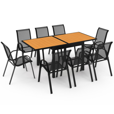 Prenez vos repas en profitant de votre extérieur grâce à cet ensemble de jardin en matière composite aspect bois. Avec sa table extensible XL mesurant de 90 à 180 cm et ses 8 chaises, le salon de jardin vous permet d'accueillir jusqu'à 8 convives sur votre terrasse pour partager un bon repas.Fabriqué avec des matériaux résistants et de qualité, l'ensemble de jardin POLY est composé d'une table extensible avec structure acier et planches en matière composite aspect bois gris anthracite. Les 8 chaises qui accompagnent la table disposent d'une structure métal et d'une toile en textilène noir. Profitez d'un réel confort d'assise et d'un bon maintien, le tout bien installé autour de cette table très design.Accueillez en grand nombre vos convives grâce à la table extensible qui se déplie et mesure jusqu'à 180 cm de longueur ! Au contraire, si vous souhaitez gagner de la place sur votre terrasse, repliez la table et profitez de ses 90 cm de longueur, peu encombrants. Notre astuce : empilez les chaises dont vous ne vous servez pas les unes sur les autres et gagnez encore plus d'espace !En plus de vous proposer un design ultra moderne, l'ensemble de jardin acier et matière composite aspect bois est facile à entretenir. Ne vous souciez plus de votre salon de jardin et laissez-le sorti tout l'été sur votre terrasse ! Pour des raisons de sécurité, nous vous conseillons de ranger les chaises de jardin en cas de fortes intempéries. De plus, si vous souhaitez les protéger, installez une housse pour chaises de jardin dessus.Dimensions du salon de jardin POLY extensible et 8 chaisesDimensions de la table dépliée : Longueur 180 cm x largeur 90 cm x Hauteur 73 cmDimensions de la table pliée : Longueur 90 cm x largeur 90 cm x Hauteur 73 cmDimensions des pieds : l.5 x H.65 cmEspace entre les pieds : L. 80 x H. 65 cmStructure de la table en aluminium et planche matière composite aspect boisDimensions d'une chaise : L. 51,5 x l. 68 x H. 84 cmDimensions de l'assise : L. 42 x l. 45 H. 41,5 cmDimensions du dossier : L. 42 x H. 47 cmNombre de chaises : 8 empilablesMatière du dossier et de l'assise : textilène noirCouleur : aluminium noir et plateau effet boisÀ monter soi-mêmeDécouvrez nos autres modèles de salons de jardin POLY : - Salon de jardin POLY extensible table 135-270 CM et 12 chaises gris anthracite- Salon de jardin POLY extensible table 135-270 CM et 12 chaises bois et gris anthracite- Salon de jardin POLY extensible table 90-180 CM et 8 chaises gris foncé- Salon de jardin POLY extensible table 135/270 cm et 12 chaises bois et noir- Salon de jardin POLY table 150 cm et 6 chaises empilables gris anthraciteDécouvrez tous nos salons de jardin sur notre boutique en ligne !