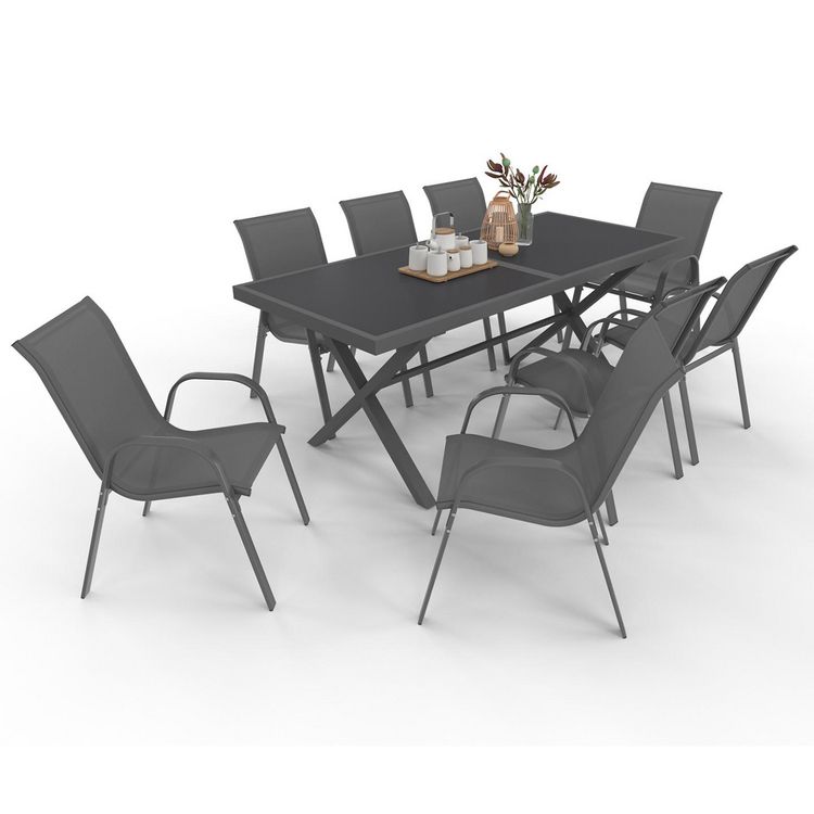 Salon de jardin SANTORIN table 190 cm pieds en croix et 8 chaises empilables gris anthracite