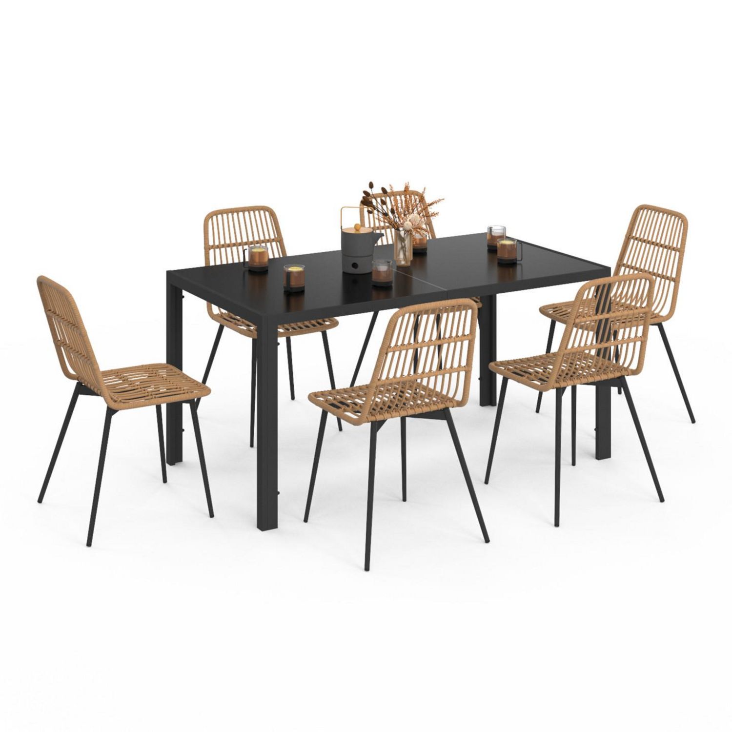 Prenez vos repas en plein air et invitez votre famille et vos amis à se réunir autour de ce salon de jardin SUMMER en métal noir et imitation rotin ! Avec sa capacité d'accueil de 6 personnes, profitez de moments chaleureux à plusieurs et échangez en toute convivialité ! Fabriqué avec des matériaux