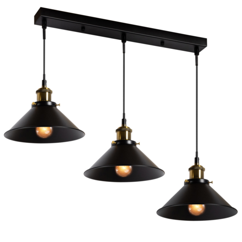 Vous cherchez depuis longtemps à changer votre suspension et vous voulez créer une ambiance chaleureuse et industrielle ? Alors n'hésitez plus et faites le choix de ce luminaire 3 ampoules en métal noir mat à prix mini !Idéal dans une cuisine, une salle à manger ou un salon, apportez une touche de modernité à votre intérieur en un tour de main grâce à ce plafonnier rétro noir et doré. Il peut s'accrocher au-dessus d'une table à manger ou d'un bar pour une ambiance chaleureuse. Son look minimaliste et élégant vous séduira à tous les coups !Ce lustre est équipé de 3 lumières individuelles. Ses abat-jours en métal noir mat et aux finitions dorées en font une suspension au format idéal. Adaptez la longueur de chacune des lampes selon vos besoins grâce à une hauteur réglable jusqu'à 80 cm maximum. Vous avez le choix d'acheter le style d'ampoule que vous voulez. Muni de douilles type E27, vous pouvez opter pour une ampoule à filament apparent ou une ampoule plus altique selon l'ambiance que vous souhaitez donner à votre pièce de vie. Décorez avec goût votre intérieur avec cette lampe suspendue chic au design à la fois industriel et vintage !Description de la suspension 3 ampoules métal et orDimensions globales : Longueur 70 cm x largeur 22 cm x Hauteur 90 cmDimensions du support : L. 50 x l. 5 x H. 2,5 cmDimensions d'une applique : Ø 22 x H. 14 cmLongueur câble : 80 cm Matériaux et coloris : métal noir mat et détails dorésType de douille (ampoules non fournies) : E27Puissance : 40 WFourni sans ampouleKit de fixation fourni (chevilles et vis)Découvrez l'ensemble de nos luminaires et lampes de chevet sur notre boutique en ligne.Et si vous aimez ce style de décoration, retrouvez nos collections industrielle et vintage.