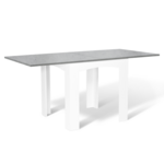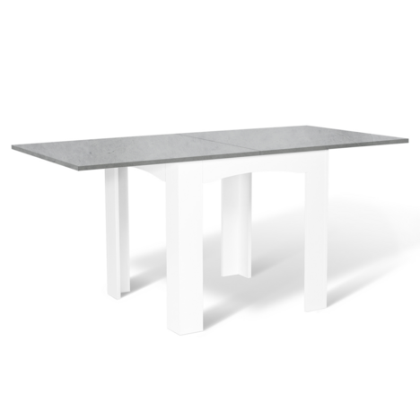Descriptif de la table à manger DONA pliante/extensible :Subjuguez votre entourage avec la table pliante/extensible DONA !Compacte et carrée une fois pliée et les rallonges rangées, elle s'adaptera parfaitement à un petit espace. Adoptez sa taille minimum pour gagner de la place et donner du volume à votre pièce ! Idéal pour une cuisine ou un salon-salle à manger 2-en-1 ! Un véritable confort au quotidien ! Vous avez vu grand, recevez du monde de façon impromptue ou organisez un repas de famille ? Pas besoin de deuxième table.Grâce à son système ingénieux de rallonges pliables à la façon d'un portefeuille, transformez-là en un instant !Avec ses dimensions généreuses une fois dépliées 160 x 78 cm et son format rectangulaire, installez jusqu'à 4-8 couverts selon vos assises pour des repas mémorables !Son design contemporain et épuré, mélange de lignes droites et arrondies, ainsi que plateau façon béton chic et moderne, apporteront design et élégance à votre intérieur.En plus d'être fonctionnelles, les courbes arrondies du piétement assurent d'être confortablement installé.Stable et robuste, en panneaux de particules, dotée de pieds d'une largeur de 11 cm, ne craignez pas d'y poser votre vaisselle, vos vases et plats ...Grâce à ses dimensions pratiques même un fois repliée, Longueur 80 cm x largeur 78 cm, en véritable caméléon, servez-vous en comme bureau d'appoint selon vos besoins du moment. Largement suffisant pour y disposer livres, papiers, ordinateur !Un table multi fonctions design parfaite pour tous les jours et les grandes occasions !Dimensions de la table à manger DONA pliable/extensible :Dimensions totales pliée : Longueur 80 x largeur 78 x Hauteur 76 cmDimensions totales dépliée : L.160 x l. 78 x H. 74 cmDimensions des pieds : L. 11 x l. 11 cmEspace entre les pieds : 52 cmSolide, elle est surélevée de 4 pieds en boisPlateau épaisseur : 2 cmÀ monter soi-mêmeRetrouvez tous nos coloris et modèles contemporains sur notre boutique en ligne :- Table à manger extensible DONA 6-8 personnes hêtre 80-160 cm- Table à manger extensible DONA 6-8 personnes blanche 80-160 cm- Table à manger extensible DONA 6-8 personnes noire plateau façon hêtre 80-160 cmA associer par exemple avec le lot de 6 chaises ROMANE grises.