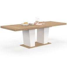 Tendance et fonctionnelle, la table à manger extensible ELIAD s'intégrera parfaitement à votre pièce. Son style contemporain apportera à votre salon une touche d'élégance unique.Grâce à son plateau extensible, cette table passe facilement d'une longueur de 200 cm à 250 cm, vous permettant d'accueillir confortablement jusqu'à 12 personnes. Que ce soit pour des repas familiaux ou des soirées entre amis, la table au pied central original vous assurera de jolis moments conviviaux !Ses panneaux en particules de bois mélaminé garantissent stabilité et robustesse à cette table à manger.Son système extensible astucieux vous permet d'utiliser intelligemment l'espace de votre salle à manger !La combinaison de bois et de blanc confère un aspect chaleureux, tout en s'intégrant harmonieusement à votre décoration intérieure.Les dimensions généreuses de la table, le plateau avec rebords d'une hauteur de 6,5 cm et l'espace entre les pieds de 46 cm, assurent un confort optimal pour tous vos invités.N'hésitez plus et craquez pour cette jolie table design bicolore qui deviendra la pièce maîtresse de vos dîners !Dimensions de la table à manger extensible ELIAD 200-250 cm bois et blancDimensions globales : Longueur 200-250 cm x largeur 90 cm x Hauteur 75 cmRallonge : 50 cmHauteur des rebords du plateau : 6,5 cmDimensions socle : L. 110 cm x l. 54,5 cmEspace entre les pieds : 46 cmMatériaux : Panneaux en particules de bois mélaminé Coloris : bois et blancCapacité : 8 à 12 personnesÀ monter soi-même Retrouvez également toutes nos autres tables à manger extensibles sur notre boutique en ligne !