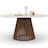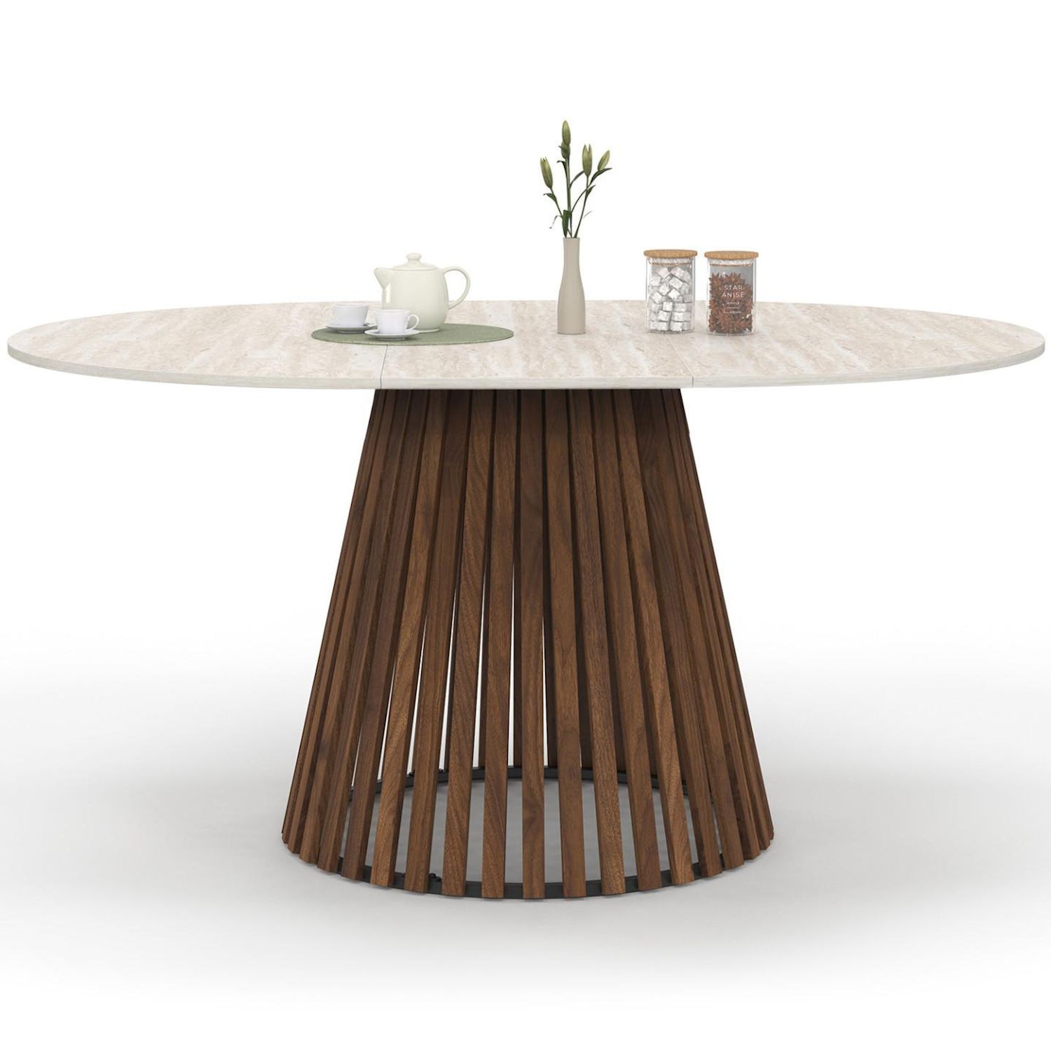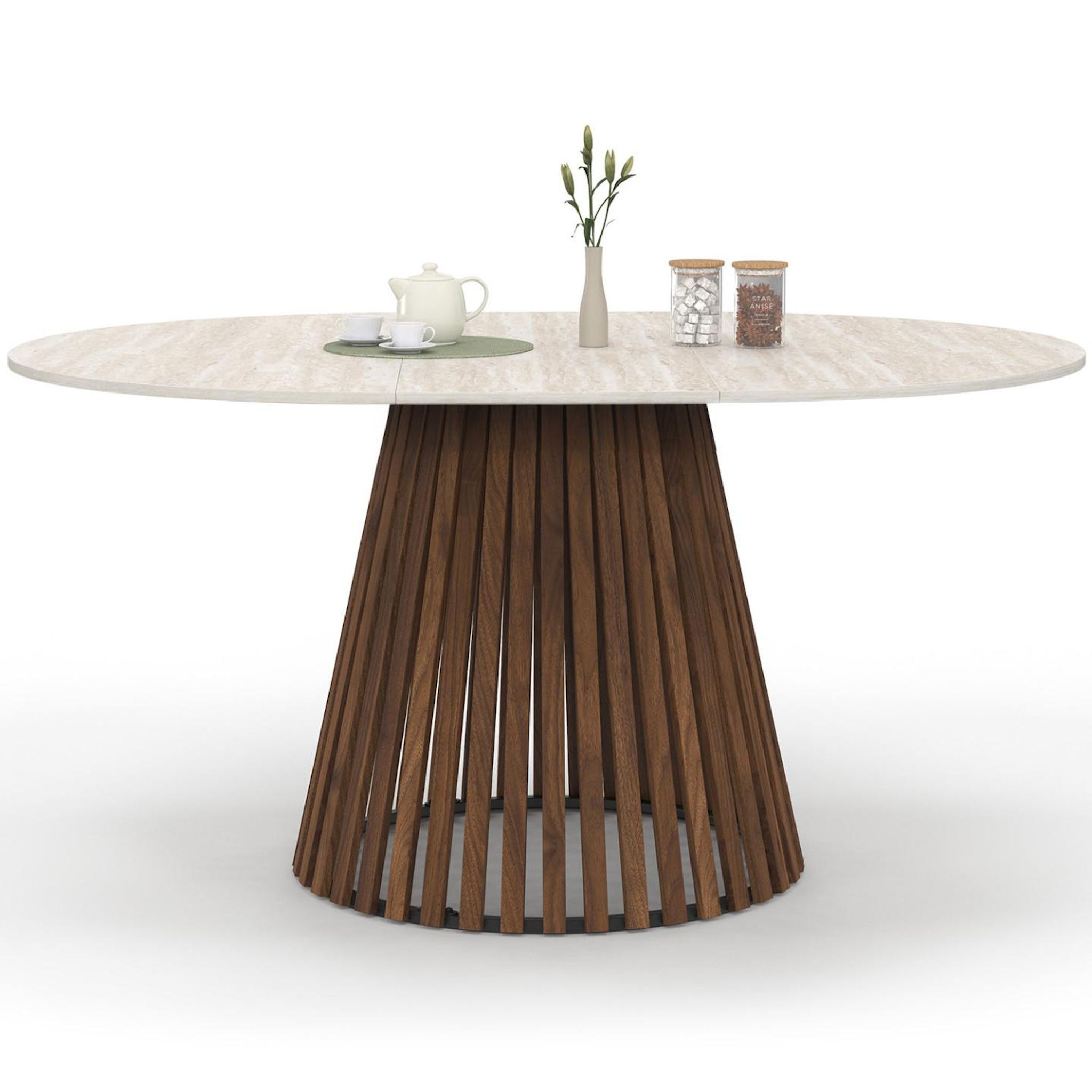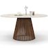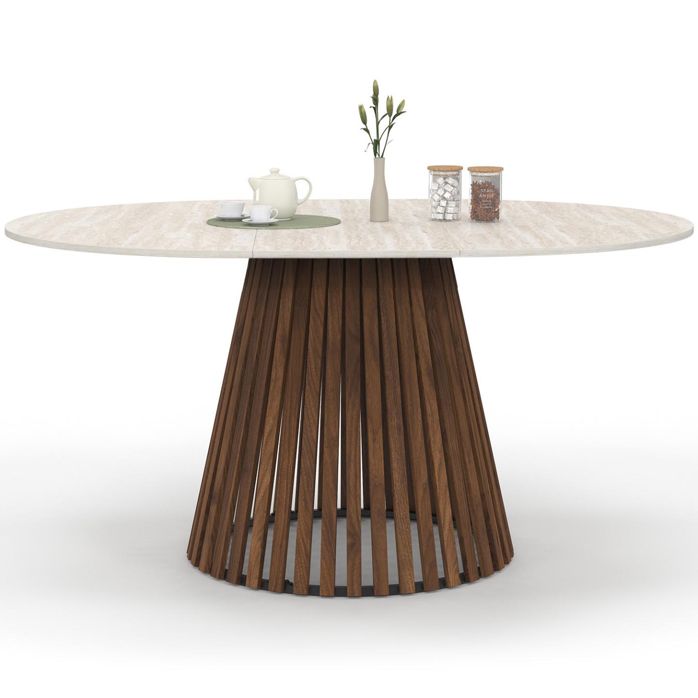 Table à manger extensible ronde CARMEN 4-8 personnes pied noyer en lattes et plateau effet travertin 110 - 150 cm