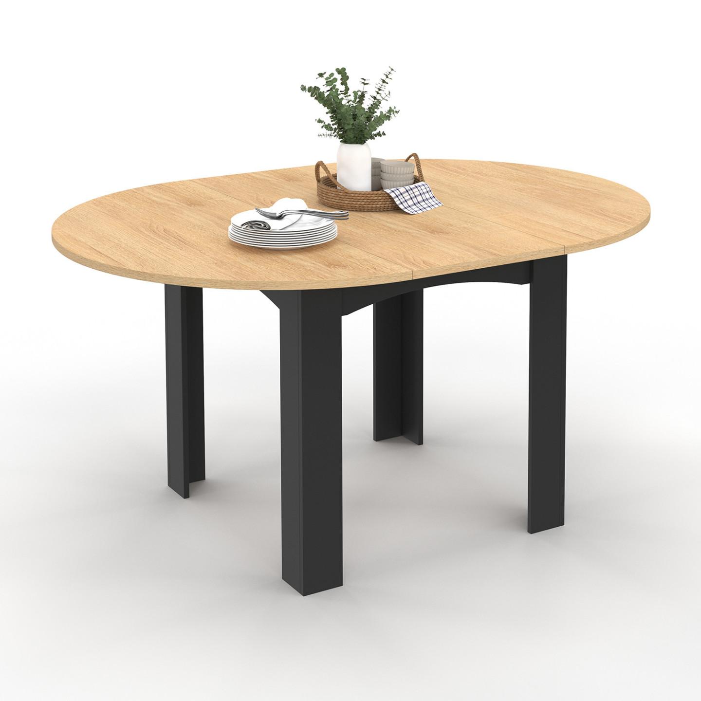 Table à manger extensible ronde DONA 4-8 personnes noire plateau façon hêtre 110-150 cm