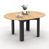 Craquez pour la table à manger ronde DONA et laissez entrer le style contemporain dans votre salle à manger ou votre cuisine !Cette table extensible bois et noir deviendra rapidement un élément phare de votre pièce dont vous ne pourrez vous passer ! Idéale pour les petits comme les plus grands espaces, la table à manger DONA avec son plateau extensible gain de place vous permettra de passer d'une capacité de 4 à 6, voire 8 personnes en un instant grâce à sa rallonge de 40 cm !Pratique et robuste, elle trouvera facilement sa place dans votre intérieur tout en garantissant une vraie stabilité !Ses courbes arrondies vous assurent d'être confortablement installé autour d'un repas convivial ou même d'un jeu de société avec votre famille ou vos amis.N'hésitez plus et optez pour cette table multifonction et design, parfaite pour le quotidien et les grandes occasions !Dimensions de la table à manger extensible ronde DONA 4-8 personnesDimensions globales : Longueur 110-150 cm x largeur 110 cm x Hauteur 75 cmDimensions des pieds : L. 10 cm x l. 10 cmEspace entre les pieds : 52 cmDimension de la rallonge : L. 110 cm x l. 40 cmMatériaux : Particules de bois (PB) mélaminé et MDFColoris : Bois et noirÀ monter soi-mêmeRetrouvez l'ensemble de notre collection contemporaine sur notre boutique en ligne !