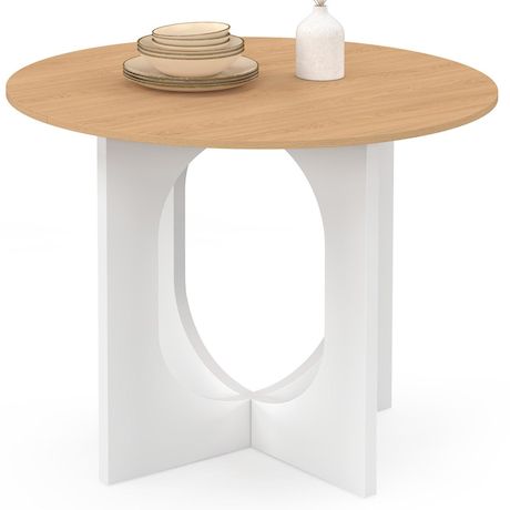 La table ALOISE 4 personnes et son plateau de diamètre 80 cm apporte un côté sophistiqué à votre intérieur ! Profitez de votre repas en toute tranquillité, autour d'un apéro en famille, entre amis ou bien installez-vous avec votre ordinateur pour consulter vos mails !Les dimensions compactes de cette table à manger sont idéales pour les petits espaces. Sa forme ronde facilite la circulation au sein de la pièce et donne un côté chaleureux. Vous pourrez ainsi intégrer facilement cette table à manger dans votre pièce de vie.L'association de son plateau en bois effet hêtre et de son pied arc en bois blanc apportera un esprit chaleureux qui se mariera parfaitement avec votre décoration intérieure en y apportant une touche d'originalité.De plus, sa structure en panneaux de particules de bois lui assure stabilité et robustesse !Optez pour le style moderne et craquez pour la table en bois ALOISE ronde 80 cm !Dimensions de la table ALOISE blanc et plateau bois effet hêtre 80 cmDimensions globales : Longueur 80 cm x largeur 80 cm x Hauteur 75 cmMatériaux : Panneaux de particules de bois (PB)Coloris : blanc et plateau boisPlateau coupé en 2 partiesCapacité : 4 personnesÀ monter soi-mêmeRetrouvez l'ensemble de nos tables à manger sur notre boutique en ligne !