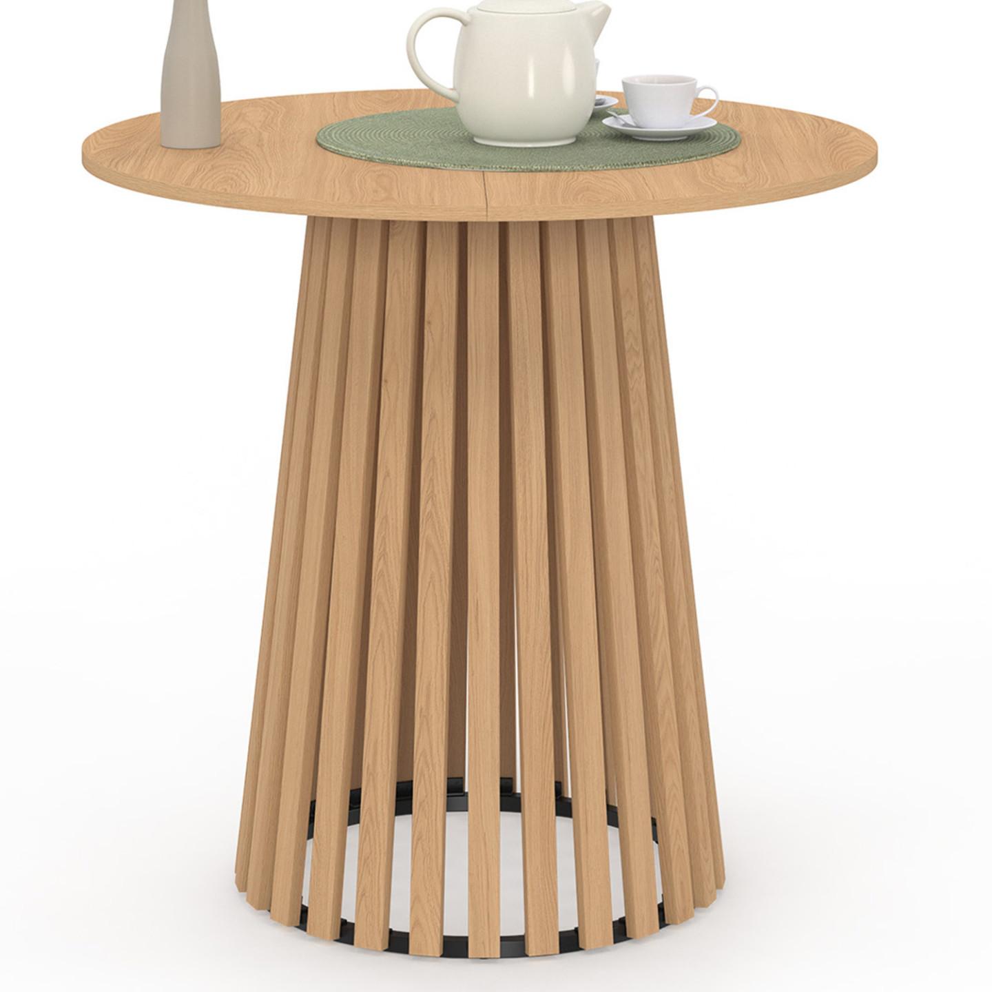 Laissez-vous séduire par cette table à manger ronde et son piétement conique ajouré qui sublimera votre pièce à vivre !Ses dimensions astucieuses, avec son plateau de 80 cm de diamètre, vous permettent d'accueillir jusqu'à 4 convives. Une table idéale pour des moments conviviaux en famille ou entre amis ! De plus, sa forme ronde design facilite la circulation au sein de la pièce.Pratique et élégante, elle répondra à tous vos besoins ! Que ce soit pour organiser un dîner en famille ou pour travailler sur votre ordinateur, cette petite table à manger saura combler toutes vos attentes.Cette table se fondra à merveille dans tous les types d'intérieur en y apportant une atmosphère chaleureuse grâce à son coloris bois. Son piétement original avec lattes ajouré apportera, de son côté, une touche sophistiquée.Son pied central est fait de lattes verticales en MDF et sa base est en métal, ce qui lui confère stabilité et robustesse, sans oublier le côté esthétique ! Optez pour le style moderne et craquez pour la table ronde 4 personnes CARMEN !Dimensions de la table à manger CARMEN ronde pied bois en lattes 4 personnesDimensions globales : Longueur 80 cm x largueur 80 cm x Hauteur 75 cmDiamètre du pied : 50 cmMatériaux : Panneaux de particules mélaminé, lattes en MDF, base pied en métalDimensions des lattes : (L) 3 x (l) 1,5 cmEpaisseur du plateau : 1,5 cm Coloris : boisPlateau en deux partiesPeut accueillir jusqu'à 4 convivesÀ monter soi-mêmeDécouvrez l'ensemble de notre collection moderne sur notre boutique en ligne !
