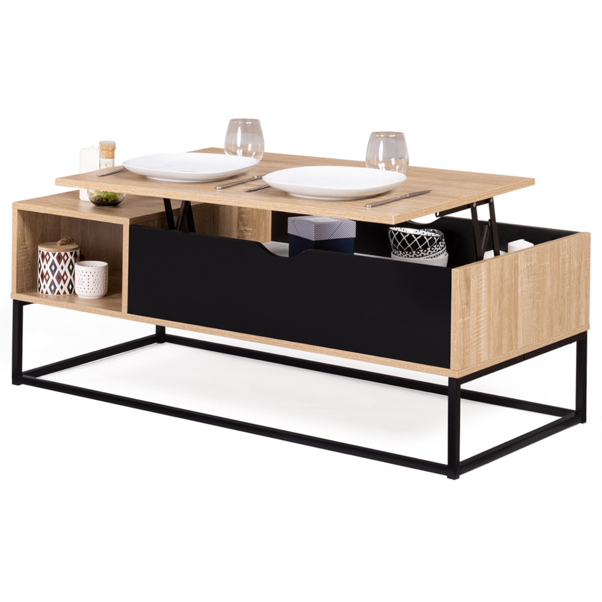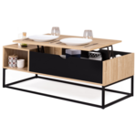 2 en 1, voici la dernière génération de table basse astucieuse avec système de plateau relevable : d'une simple table basse, elle se transforme en table à manger pratique !Son plateau relevable, adaptable à toutes les situations, vous permettra de prendre un repas ou une collation devant la télévision, d'organiser un apéritif entre amis, ou encore de vous aménager un coin bureau improvisé tout en gardant une position confortable dans votre canapé. Grâce à son mécanisme, le plateau de cette jolie table basse se relève en un clin d'oeil.Fonctionnelle, elle offre également deux compartiments de rangement. Dans le coffre situé sous le plateau, rangez vos revues, votre vaisselle et gardez un espace libre pour poser vos plateaux télé ou votre ordinateur !Son petit plus : la niche latérale pour entreposer vos télécommandes et autres petits objets sans encombrer le plateau de votre table basse !La structure de cette jolie table basse, en panneaux de particules de bois noir et façon hêtre (épaisseur 1,5 cm), lui confère stabilité et robustesse.Optez pour l'ingéniosité de cette table basse bicolore à plateau relevable en bois : soirées télé réussies assurées ! Sublimez votre intérieur avec ses matériaux bruts, ses formes simples et l'alliance du bois et du métal !Pratique et déco, cette pièce maîtresse modernisera votre salon ! Les lignes et le style épuré donneront à votre intérieur un aspect loft du meilleur effet !Dimensions de la table basse tablette relevable bicolore avec rangementsDimensions globales : Longueur 110 cm x largeur 55 cm x Hauteur 44,5 cmDimension du plateau relevable : L. 77 x l. 55 cmDimensions du compartiment sous plateau : L. 76 x l. 52 x H. 19 cmHauteur de la table une fois ouverte : 55,5 cmDimensions de la niche latérale : L. 29,5 x pr. 55 x H. 19 cmÉpaisseur des plateaux bois : 1,5 cmÉpaisseur des tubes métal : 2 x 2 cmÀ monter soi-mêmeRetrouvez l'ensemble de notre collection industrielle sur notre boutique en ligne.