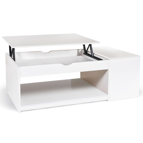 Style et gain de place sont les maîtres-mots de cette table basse à plateau relevable et coffre latéral en bois blanc ELEA. Avec ses nombreux espaces de rangements elle sera un véritable atout pour un intérieur moderne et bien rangé ! Pour manger devant votre série préférée à la télé ou travailler confortablement depuis votre canapé, la table basse à plateau relevable sera parfaite pour vous.Parce que vous recevez sans doute des invités dans votre salon, la table basse blanche est dotée de plusieurs rangements pratiques. Idéal pour vos moments de détente, ce meuble est équipé d'un mécanisme en acier laqué époxy qui permet à la tablette de se relever pour une position confortable et dissimule un premier espace de rangement. Son coffre latéral d'une hauteur de 40 cm est parfait pour ranger quelques bouteilles ainsi que le nécessaire pour l'apéritif ! Enfin, son étagère inférieure basse offre quant à elle un espace ouvert où ranger télécommandes, programmes TV, et magazines pour que rien ne traîne !Equipez votre séjour avec style et élégance grâce à cette table basse blanche à plateau relevable aussi pratique que tendance !Vous n'avez plus qu'à profiter des espaces de rangement qu'offre cette table basse et à passer des moments agréables de détente ou de travail confortablement installé !Dimensions de la table de salon ELEADimensions globales : Longueur 110 cm x largeur 60 cm x Hauteur 45 cmHauteur plateau relevé : 58 cmDimensions intérieures coffre sous plateau : L. 77 x l. 56,5 x H. 7,5 cmDimensions intérieures coffre latéral : L. 56 x l. 28 x H. 40 cmMatériau : Panneaux de particules mélaminésA monter soi-mêmeCe modèle existe également dans d'autres coloris :- Table basse plateau relevable ELEA avec coffre bois noir et hêtre- Table basse plateau relevable ELEA avec coffre bois blanc et façon hêtreRetrouvez l'ensemble de nos tables basses avec plateau relevable sur notre boutique en ligne.