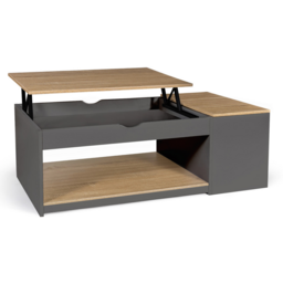 Style et gain de place sont les maîtres-mots de cette table basse à plateau relevable et coffre latéral en bois gris et coloris bois façon hêtre ELEA. Avec ses nombreux espaces de rangement elle sera un véritable atout pour un intérieur moderne et bien rangé ! Pour manger devant votre série préférée à la télé ou travailler confortablement depuis votre canapé, la table basse à plateau relevable sera parfaite pour vous.Parce que vous recevez sans doute des invités dans votre salon, la table basse bicolore grise et bois façon hêtre est dotée de plusieurs rangements pratiques. Idéal pour vos moments de détente, ce meuble est équipé d'un mécanisme en acier laqué époxy qui permet à la tablette de se relever pour une position confortable et dissimule un premier espace de rangement.Son coffre latéral d'une hauteur de 40 cm est parfait pour ranger quelques bouteilles ainsi que le nécessaire pour l'apéritif !Enfin, son étagère inférieure basse offre quant à elle un espace ouvert où disposer télécommandes, programmes TV et magazines pour que rien ne traîne !Equipez votre séjour avec style et élégance grâce à cette table basse bois gris et façon hêtre à plateau relevable aussi pratique que tendance !Vous n'avez plus qu'à profiter des espaces de rangement qu'offre cette table basse et à passer des moments agréables de détente ou de travail confortablement installé !Dimensions de la table de salon bicolore gris et bois façon hêtreDimensions globales : Longueur 110 cm x largeur 60 cm x Hauteur 45 cmHauteur plateau relevé : 58 cmDimensions intérieures coffre sous plateau : L. 77 x l. 56,5 x H. 7,5 cmDimensions intérieures coffre latéral : L. 56 x l. 28 x H. 40 cmMatériau : Panneaux de particules mélaminésA monter soi-mêmeCe modèle existe également dans d'autres coloris :- Table basse plateau relevable ELEA avec coffre bois blanc- Table basse plateau relevable ELEA avec coffre bois blanc et façon hêtre- Table basse plateau relevable ELEA avec coffre bois noir et façon hêtre- Table basse plateau relevable ELEA avec coffre bois façon hêtre et blanc- Table basse plateau relevable ELEA avec coffre bois blanc et grisRetrouvez l'ensemble de nos tables basses avec plateau relevable sur notre boutique en ligne !