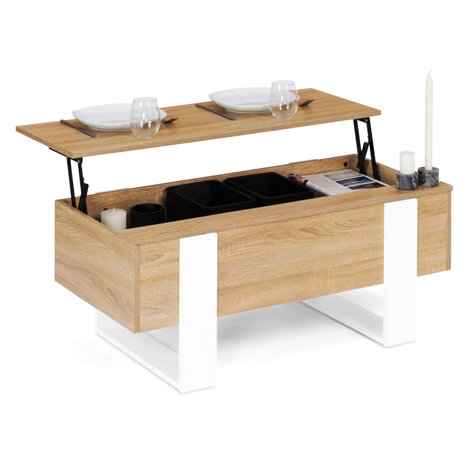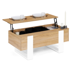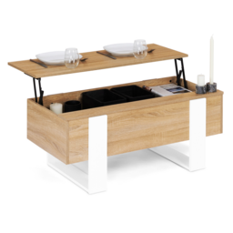 2 en 1, craquez pour cette table basse astucieuse : avec système de plateau relevable, d'une simple table basse, elle se transforme en table à manger pratique ! En effet, grâce à son mécanisme en acier laqué epoxy, le plateau de cette jolie table basse se relève en un clin d'œil.Son plateau relevable, adaptable à toutes les situations, vous permettra d'organiser un apéritif entre amis, de prendre un repas ou une collation devant la télévision ou encore de vous aménager un coin bureau improvisé tout en gardant une position confortable dans votre canapé. Fonctionnelle, elle offre également une solution de rangement fermé grâce au compartiment situé sous le plateau. Rangez revues, télécommandes ou encore snacks et gardez un espace libre pour poser vos plateaux télé ou votre ordinateur !Son plus : un petit rebord additionnel ouvert sur toute la longueur de la table pour poser votre téléphone, télécommande ou tasse de thé et laisser l'espace du plateau libre pour vos couverts ou votre ordinateur !Une fois fermée, cette table basse bicolore bois et blanc apportera un style loft industriel moderne à votre intérieur. De plus, son design sobre et intemporel, lui confèrera une atmosphère chaleureuse et conviviale à votre espace salon, de quoi passer des soirées cocooning !Sa structure en panneaux de particules de bois (épaisseur 1,5 cm) à l'allure massive et ses formes symétriques donneront un esprit atelier à votre pièce, et lui assurent stabilité et robustesse. Optez pour l'ingéniosité de cette table basse à plateau relevable bicolore, pratique et déco qui deviendra la pièce maîtresse de votre salon ! Dimensions de la table basse plateau relevable bicolore PHOENIXDimensions globales : Longueur 97,5 cm x largeur 50 cm x Hauteur 40 cmHauteur de la table une fois ouverte : 53,5 cmDimensions de l'espace de rangement : L. 96 x l. 48,5 x H. 12 cmMatériaux : panneaux en particules de bois (PB), épaisseur 1,5 cmColoris : bois et blancÀ monter soi-mêmeCe modèle de table basse plateau relevable PHOENIX existe en bois et noir, bois gris et bois effet vieilli. Retrouvez l'ensemble de notre collection moderne sur notre boutique en ligne !
