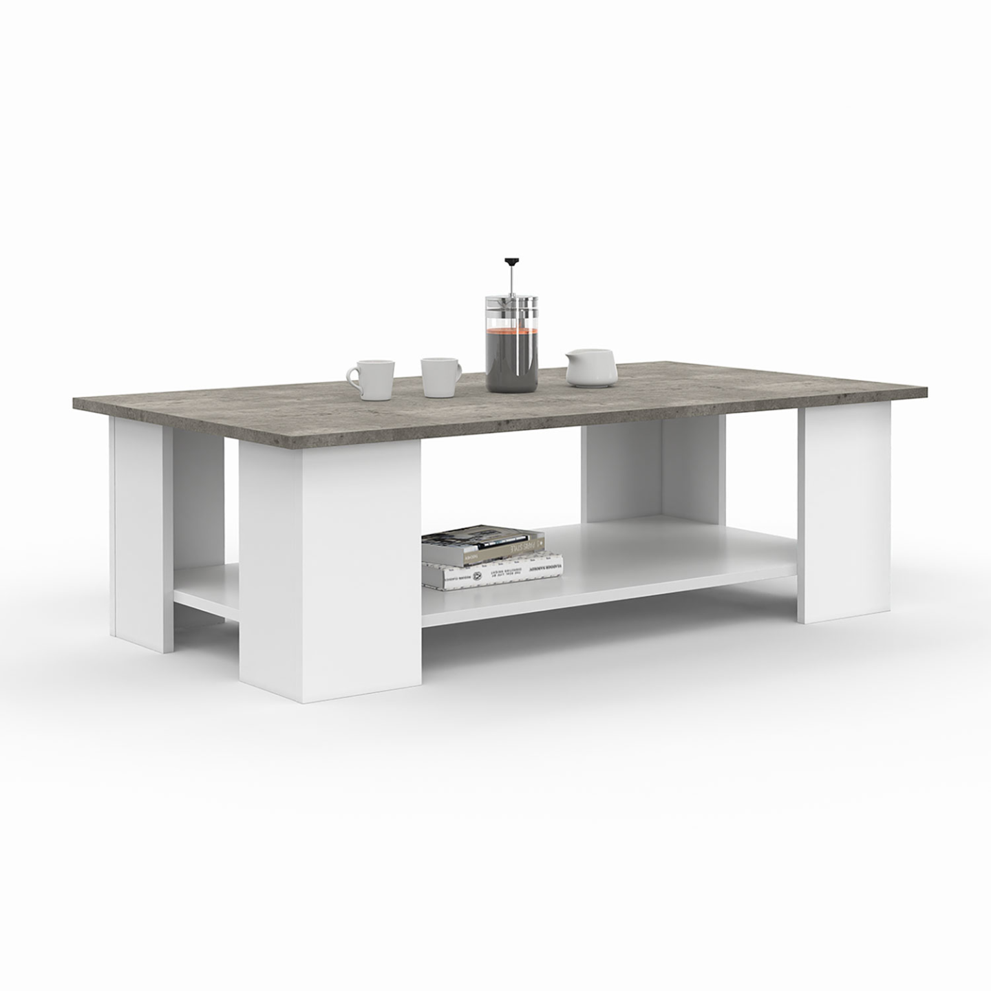 Laissez entrer le mobilier contemporain dans votre intérieur avec la table basse rectangulaire blanche au plateau effet béton ELI ! Elle saura parfaitement s'intégrer dans les intérieurs urbains mais aussi plus authentiques.Avec son joli revêtement effet béton, le plateau n'a pas besoin de recevoir de nappe pour le cacher ou le décorer, et aura même son petit effet devant vos invités avec son côté minéral et sauvage et son look authentique si séduisant !Facile à déplacer, avec son plateau imitation béton qui n'alourdit pas la table, elle est également facile à nettoyer et ne craint pas les tâches.Gain de place, la table basse est munie d'une étagère basse pour poser vos revues, télécommandes, petits objets de déco, en toute discrétion, et à portée de main.Esthétique et pratique, avec son format rectangulaire compact convivial, il sera facile de circuler autour et de l'intégrer dans un petit espace. Pratique et tendance, cette table est idéale pour des apéritifs réussis !Stable et robuste, en panneaux de particules, et dotée d'un piétement épais, ne craignez pas d'y poser vos plateaux télé.La table basse ELI offre de bonnes soirées télé en perspective autour d'un verre ou devant un plateau repas, en famille ou entre amis !Dimensions de la table basse rectangulaire plateau effet béton ciréDimensions globales : Longueur 100 cm x largeur 55 cm x Hauteur 31,5 cmHauteur entre les 2 plateaux : 22,5 cmMatériaux : Panneaux de particules Coloris : blanc et gris effet béton ciréÀ monter soi-mêmeVisserie incluseCe modèle existe également au format carré. Vous pouvez assortir votre nouvelle table basse avec le meuble TV ELI !Découvrez l'ensemble de notre collection effet béton sur notre boutique en ligne.