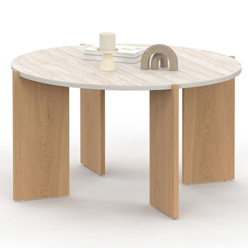 Cette table basse ronde ARMONIA allie élégance minérale et chaleur naturelle grâce à son plateau effet travertin associé à un piètement effet bois.Son design épuré et contemporain s'intègre parfaitement dans un intérieur moderne, scandinave ou naturel.Avec son diamètre de 73 cm, elle offre une surfa