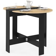 Ultra moderne, la table à manger pliable bicolore ronde EDI aux 2 rabats façon hêtre, une fois totalement dépliée, vous offrira l'effet d'un chemin de table avec sa bande noire centrale. Idéalement conçue pour les studios ou les petits espaces de vie, elle se plie et se déplie en un clin d'oeil, pour recevoir vos proches à l'occasion.Ses 2 allonges intégrées la rendent multifonctions : table de salle à manger, table de cuisine, console, bureau d'appoint, selon vos besoins et la place dont vous disposez. Rabattez les plateaux des deux côtés ou d'un seul côté, pour accueillir de 2 à 4 personnes autour de la table. Grâce à son plateau et sa structure en particules de bois, cette table au style contemporain est stable et robuste.Peu profonde, une fois repliée en mode console, vous disposez d'un espace suffisant pour poser votre corbeille à fruits ou votre planche à découper sans trop encombrer votre cuisine.Transformée en table de travail, installez-vous avec votre ordinateur pour consulter vos mails ou trier vos documents.Astucieuse et fonctionnelle, cette table gain de place s'adapte facilement à toutes les pièces de votre intérieur, centrée ou placée le long du mur.Facile d'entretien, hyper pratique, modulable, une véritable table caméléon !Dimensions de la table pliante EDI ronde bois et noirDimensions dépliée : Longueur 103,5 cm x largeur 76 cm x Hauteur 75 cmDimensions repliée : L. 76 x l. 27,5 x H.75 cmPieds pivotant à 90°Largeur partie fixe : 24 cmLargeur partie tablette relevable : 40 x 76 cmTaille pied pivotant : 10,5 cmTaille pied fixe : 13,5 cmMatériaux : panneaux de particules de bois (PB)Coloris : bois et noirÀ monter soi-mêmeDécouvrez l'ensemble de notre collection contemporaine sur notre boutique en ligne !