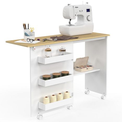Le bureau pour machine à coudre pliable à roulettes, blanc et bois façon hêtre, au style contemporain et épuré s'intègre parfaitement dans tous les types d'intérieurs.Son grand plateau dépliable de 118 cm offre un bel espace de travail pour installer votre machine à coudre, vos outils et vos tissus,