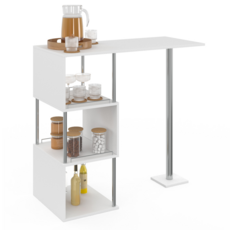 En savoir +La table haute 2 personnes KARL blanche et ses 3 étagères ajourées organisera parfaitement l'espace de votre cuisine !Grâce à son design moderne, elle s'adaptera idéalement à tout type de décoration tout en gardant un esprit convivial et chaleureux.Multifonction, ce mange debout KARL est à la fois idéal pour prendre un déjeuner sur le pouce, un repas ou encore travailler sur votre ordinateur.Fonctionnel et astucieux, il est aussi un véritable gain de place pour les petits espaces ! Ses 3 compartiments latéraux sécurisés à l'aide de barre de renfort vous offrent la possibilité de stocker votre vaisselle, condiments ou ustensiles à portée de main !De plus, cette table haute et son généreux plateau de 110 cm peuvent accueillir jusqu'à 2 personnes. En effet vous pourrez l'associer avec des tabourets de bar ! De son côté, sa structure en panneaux de particules bois (PB) et métal chromé lui assure une bonne stabilité et robustesse.Alors n'hésitez plus et craquez pour cette table de bistrot bicolore ultra tendance pour aménager votre cuisine tout en optimisant votre espace ! Dimensions de la table haute de bar KARL 2 personnesDimensions globales : Longueur 110 cm x largeur 50 cm x Hauteur 103 cmDimensions socle du pied : L. 20 x l. 20 cmÉpaisseur pied : Diamètre 5 cmDimensions étagères : L. 50 x l. 38 x H. 32 cm - diamètre 2,5 cmDimensions barres de protection : L. 30 x H. 2,5 cm - diamètre 0,5 cmMatériaux : panneaux de particules mélaminés (PB) + métal chroméColoris : blanc et chromeCe modèle est également disponible en version industrielle.Retrouvez l'ensemble de notre collection contemporaine sur notre boutique en ligne !