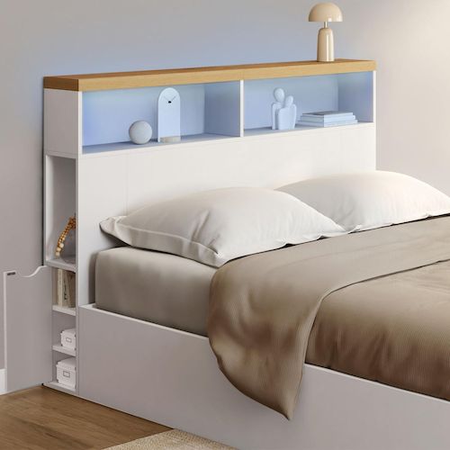 Tête de lit sur pied LUNA à LEDS 145 cm avec rangements fermés et niches blanc et plateau effet bois