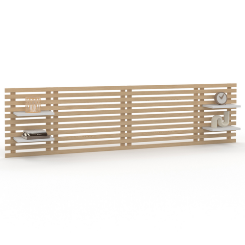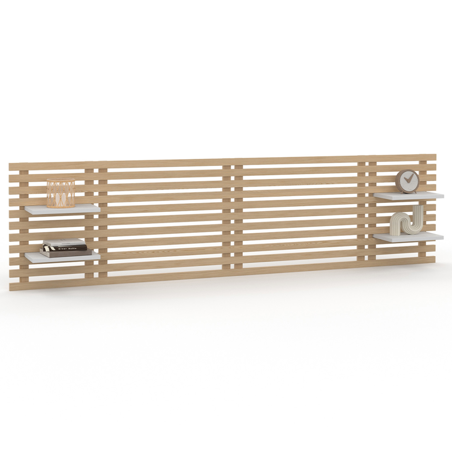 Tête de lit suspendue en lattes AVA 240 cm bois clair et étagères blanches
