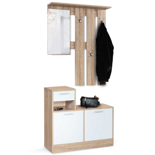Apportez une touche moderne à votre intérieur en optant pour ce vestiaire d'entrée avec miroir et paroi murale en lattes aux coloris façon hêtre portes blanches. Ce meuble s'adaptera parfaitement à votre décoration grâce à son design fonctionnel, chic et tendance ! L'association des deux couleurs procure à ce vestiaire un design très contemporain. La partie supérieure est composée d'un miroir et de 3 patères en inox pour suspendre vos vestes et manteau. Doté d'un miroir et de 3 patères double crochet en quinconce, ce meuble 2 en 1, meuble à chaussures et portant, arbore un style soigné tout en restant fonctionnel au quotidien.Avec son meuble bas composé de 2 abattants, d'1 niche et d'1 tiroir, ce vestiaire comporte tous les éléments indispensables pour organiser votre intérieur ! Grâce à son mécanisme à ouverture facile, vous pourrez ranger jusqu'à 8 paires de chaussures soit 16 chaussures. Sa niche d'une hauteur de 13 cm vous permettra de déposer vos clefs, un vide poche ou tout autre objet. Son tiroir d'une hauteur de 11,5 cm sera idéal pour ranger vos papiers et documents en toute discrétion. Maxi gain de place, il apporte une valeur ajoutée à votre vestibule en le décorant et en le meublant sans le surcharger.2 éléments aux formes asymétriques à combiner ou à dissocier selon vos envies ! Optez pour ce vestiaire d'entrée avec miroir multifonction et embellissez votre entrée !Dimensions du vestiaire d'entrée avec miroir design hêtre portes blanches- Dimensions totales : Longueur 80 CM x largeur 30 CM x Hauteur 180 CM- Dimensions du meuble à chaussures : L. 80 x l. 30 x H. 73 CM- Dimensions des deux range-chaussures : L. 37 x l. 30 x H. 37 CM- Dimensions de la niche : L. 37 x l. 30 x H. 13 CM- Dimensions du tiroir : L. 37 x l. 30 x H. 11,5 CM- Dimensions de la partie supérieure du portant : L. 80 x l. 20 x H. 100 CM- Dimensions du miroir : L. 30 x H. 56 CM- Matériaux : panneaux de particules en bois 1,5 CM et miroir en verre- Coloris : hêtre et blanc- Kit de fixation inclus- À monter soi-mêmeRetrouvez nos autres modèles également disponibles sur notre site pour aménager votre entrée.Retrouvez toute notre collection scandinave sur notre boutique en ligne !