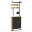 Grâce au meuble d'entrée BOSTON, tout est à portée de main ! Accrochez vos vestes et manteaux tout en rangeant vos chaussures dans l'un des deux tiroirs.Vous pouvez y ordonner jusqu'à 12 paires de chaussures, 6 paires par compartiment. Profitez du dessus du rangement à chaussures pour poser vos clés ou votre sac à main. Les 8 patères du portant, en métal noir permettent de suspendre facilement et rapidement vos manteaux, vestes, écharpes, sacs et autres vêtements.Toute la famille trouvera une place pour ranger son manteau ou ses chaussures à l'abri de la poussière ! Les 2 espaces de rangement à chaussures sont séparés par une cloison intermédiaire pour organiser votre dressing à chaussures. Le format des portes, gain de place et astucieux, permet une ouverture facilitée.Profitez de ce vestiaire d'entrée BOSTON pour embellir votre intérieur, recevoir les affaires de vos invités, ou organiser votre rangement dans une buanderie, une entrée ou une chambre à coucher.Dimensions du vestiaire d'entrée BOSTONDimensions globales : Longueur 63,5 cm x largeur 23,5 cm x Hauteur 180 cmDimensions de la partie meuble chaussures : L. 63,5 x l. 23.5 x H. 85 cmLongueur de la barre de penderie : 60 cmDimensions pieds : 9 cmMatériaux : Panneaux de particules et métalColoris : bois et noir8 patères amoviblesCapacité de rangement : jusqu'à 12 paires de chaussuresÀ monter soi-même Ce modèle existe également en version LUIS coloris bois clair design industriel.Retrouvez l'ensemble de nos meubles à chaussures et de nos vestiaires et meubles d'entrée sur notre boutique en ligne !