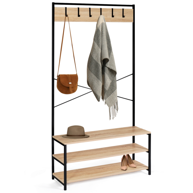 Donnez une touche industrielle à votre intérieur avec notre vestiaire d'entrée DETROIT bi-matière bois et métal noir.Son style moderne, contemporain et ses lignes sobres offriront à votre entrée un esprit factory ! De quoi accueillir vos invités dans une ambiance ultra chaleureuse type loft, cosy et tendance !Esthétique et fonctionnel, ce joli vestiaire d'entrée DETROIT trouvera idéalement sa place dans tous les intérieurs urbains et contemporains, mais aussi plus rustiques.Ce vestiaire d'entrée tendance dispose de plusieurs espaces de rangement. Ses 6 crochets en métal sont spécialement conçus pour accrocher tous vos manteaux, chapeaux, accessoires. Fini les manteaux qui traînent dans l'entrée ! Ses 3 larges tablettes vous permettront également de stocker toutes vos chaussures. La structure du vestiaire, en métal noir (épaisseur des tubes 2 cm x 2 cm), lui confère une vraie stabilité et une véritable solidité. Le joli croisillon participe à l'esthétisme et à la robustesse de la structure. La matière et la couleur des étagères en particules de bois (PB épaisseur 1,5 cm) lui confèrent une véritable authenticité.Maxi gain de place, il apporte une réelle valeur ajoutée à votre entrée en la décorant et en la meublant sans l'alourdir en toute simplicité.Pratique, simple, efficace, pas cher ! Il remplit parfaitement sa fonction !Laissez-vous séduire dès maintenant par notre vestiaire d'entrée industriel à petit prix !Dimensions du vestiaire d'entrée DETROIT design industrielDimensions totales : L. 100 x l. 32 x H. 180 cmEpaisseur des planches : 1,5 cmÀ monter soi-mêmeD'autres modèles sont également disponibles sur notre site pour aménager votre entrée.Retrouvez toute notre collection DETROIT sur notre boutique en ligne !